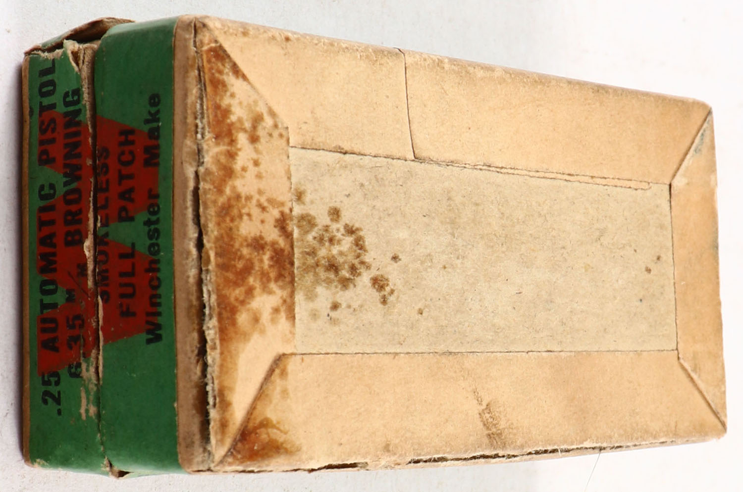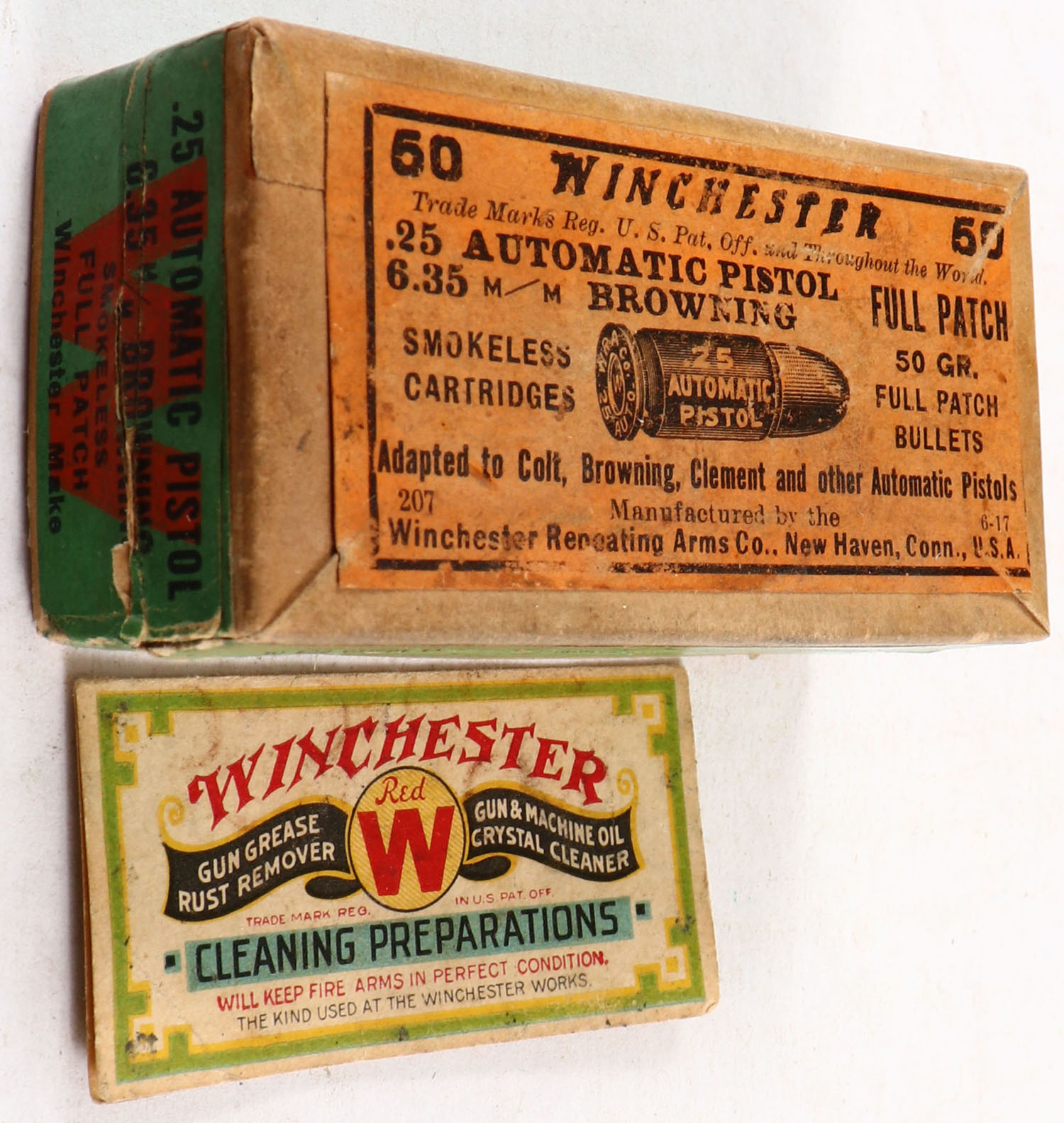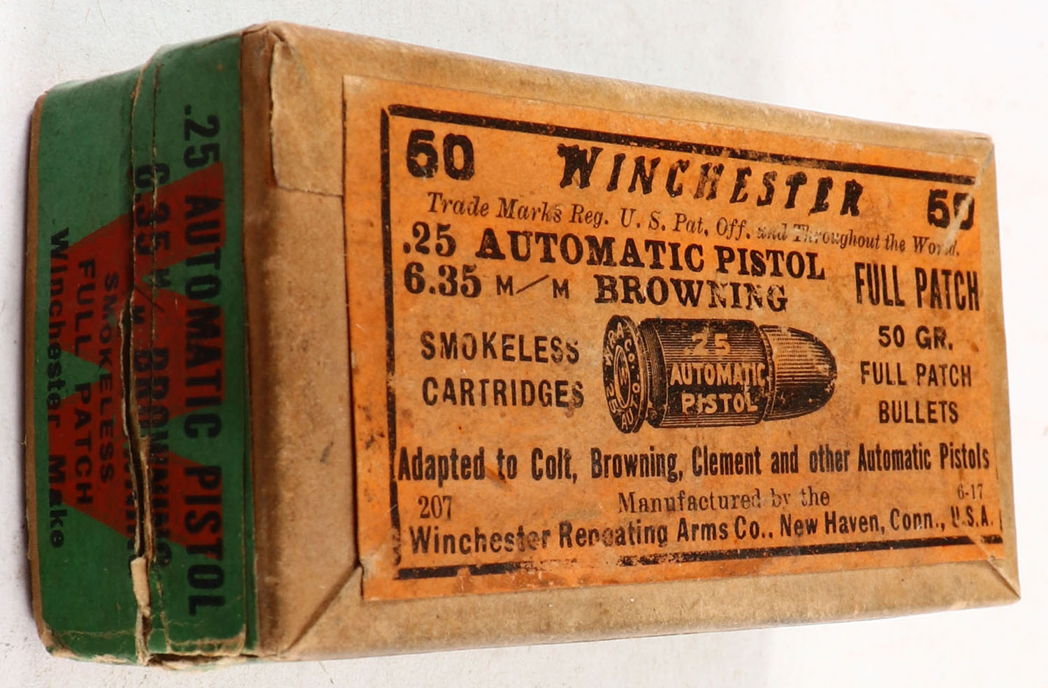 Winchester, Smokeless Cartridges, .25 Automatic Pistol (6.35mm), 50 Gr. Full Patch Bullets, full of mixed ammo, has insert, 2pc. Buff box with orange top & green side sealing labels, box has 3 seam splits on bottom edges, very good color, some age soiling & color fading, corners are mostly sharp, edges are mostly crisp, labels are intact, insert is minty, ammo is excellent. Grade: Very Good - Value: 20 to 60