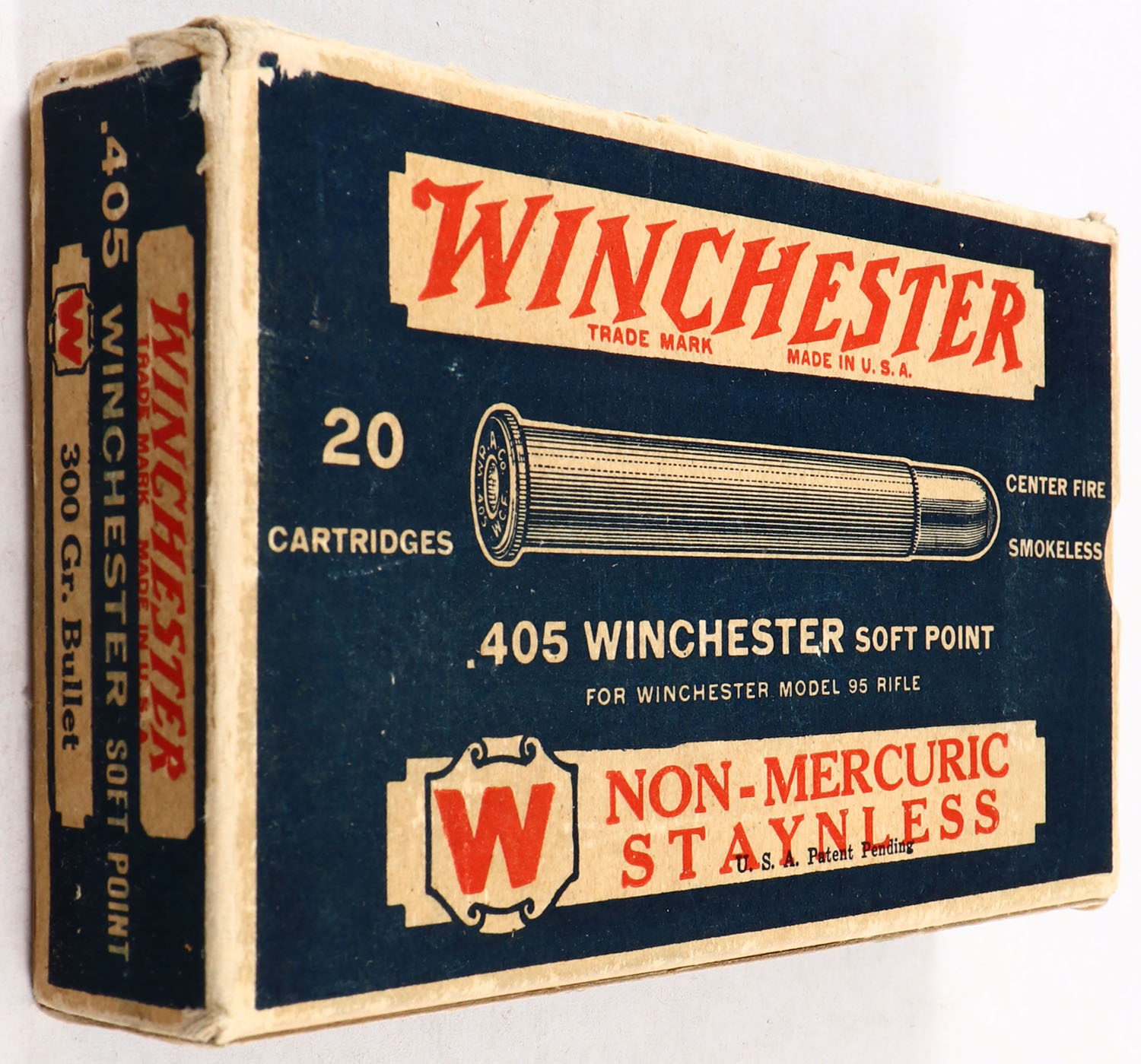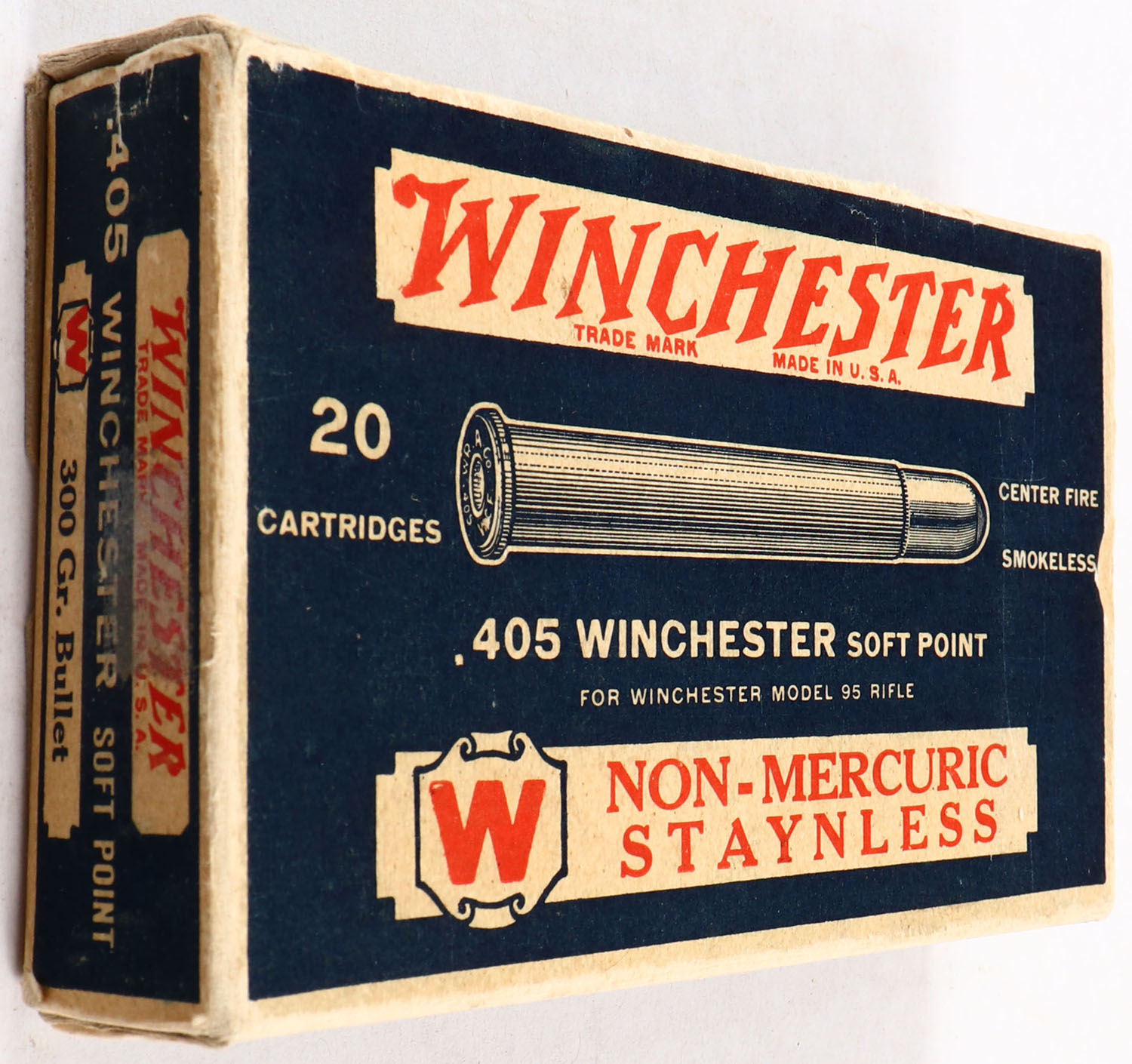 Winchester, Non-Mercuric Staynless, .405 Winchester, 300 Grain Soft Point, Full, 1pc. Blue, white & red box, box is solid with very good color, minor age soiling, minor edge wear, end flaps are solid, ammo is excellent. Grade: Excellent - Value: 50 to 200