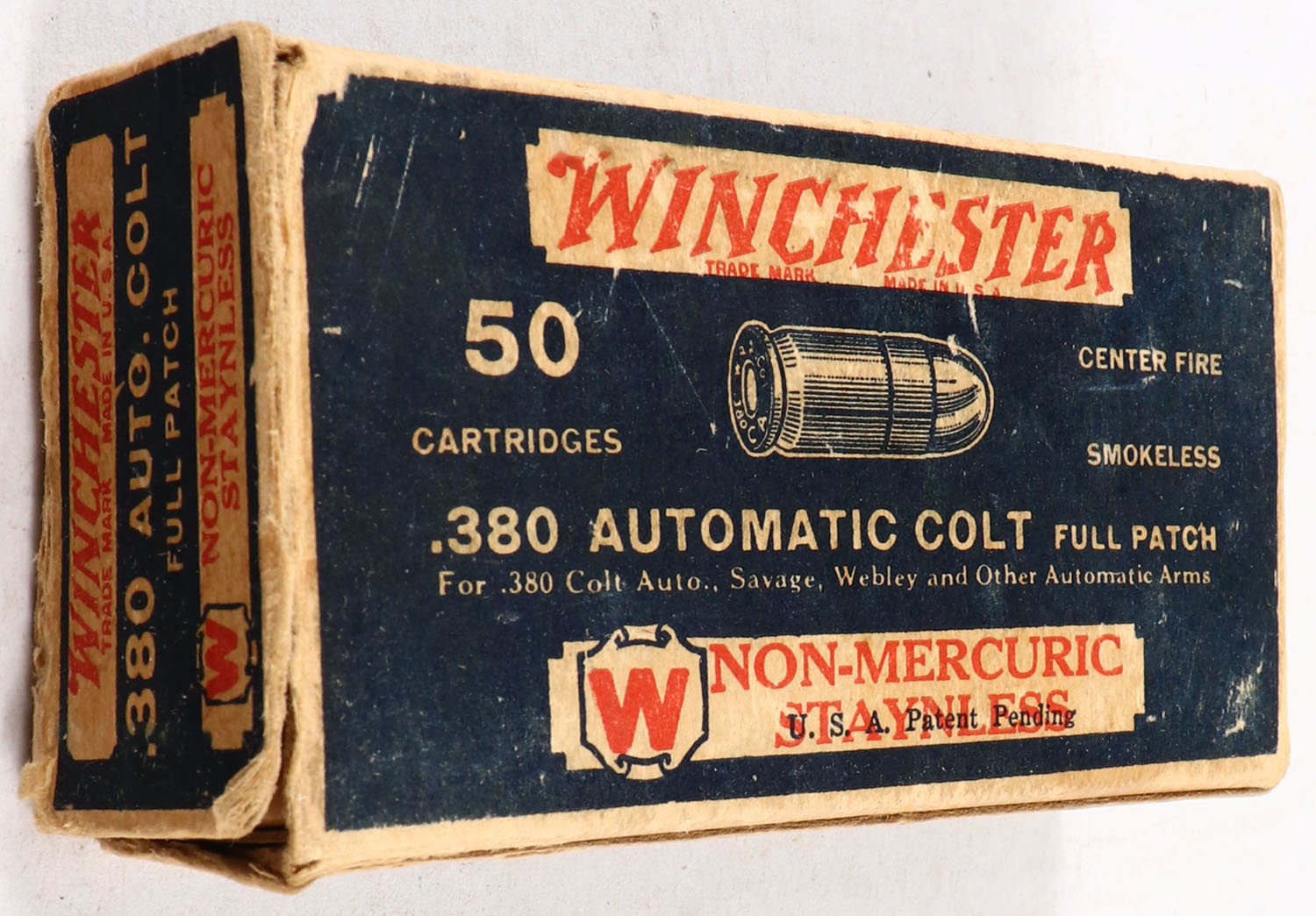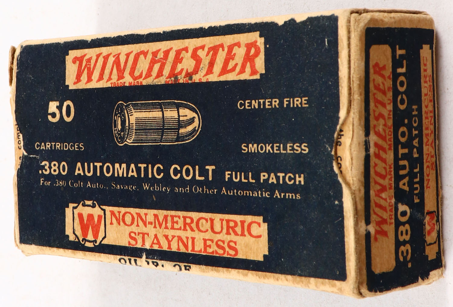 Winchester, Non-Mercuric Staynless, .380 Automatic Colt, Oilproof, Partial 24rds., 1pc. Blue white & red box, left end flap is torn, very good to excellent color, minor age soiling, some shelf wear, minor corner wear, ammo is very good. Grade: Very Good - Value: 10 to 50
