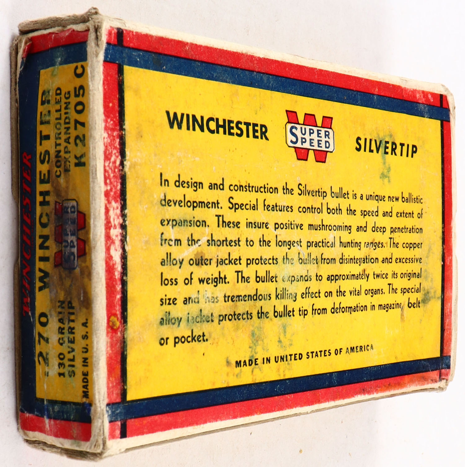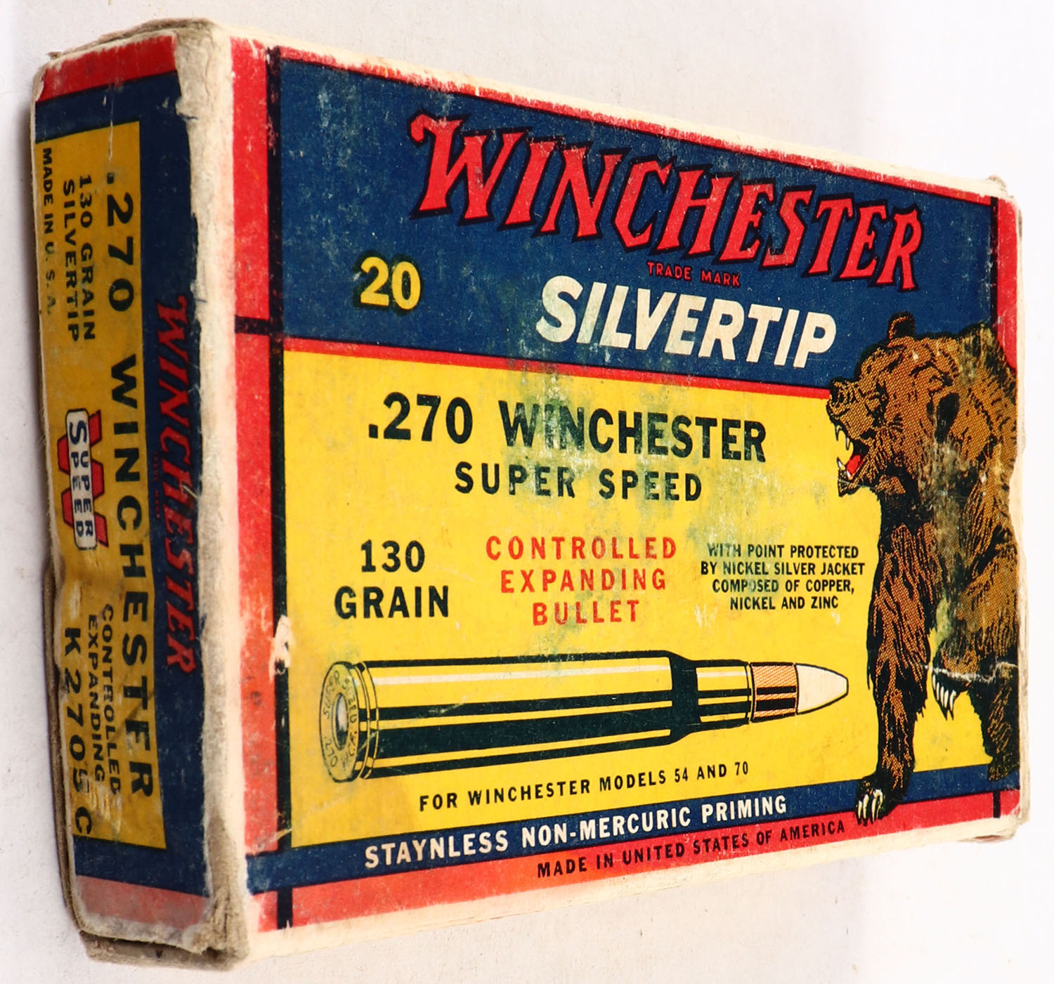 Winchester, Silvertip, .270 Winchester, 130 Grain Controlled Expanding Bullet, Full, 1pc. Yellow blue & red bear box, box is solid with very good to excellent color, some shelf & edge wear, corner wear, end flaps are solid, ammo is excellent. Grade: Very Good ++ - Value: 40 to 120