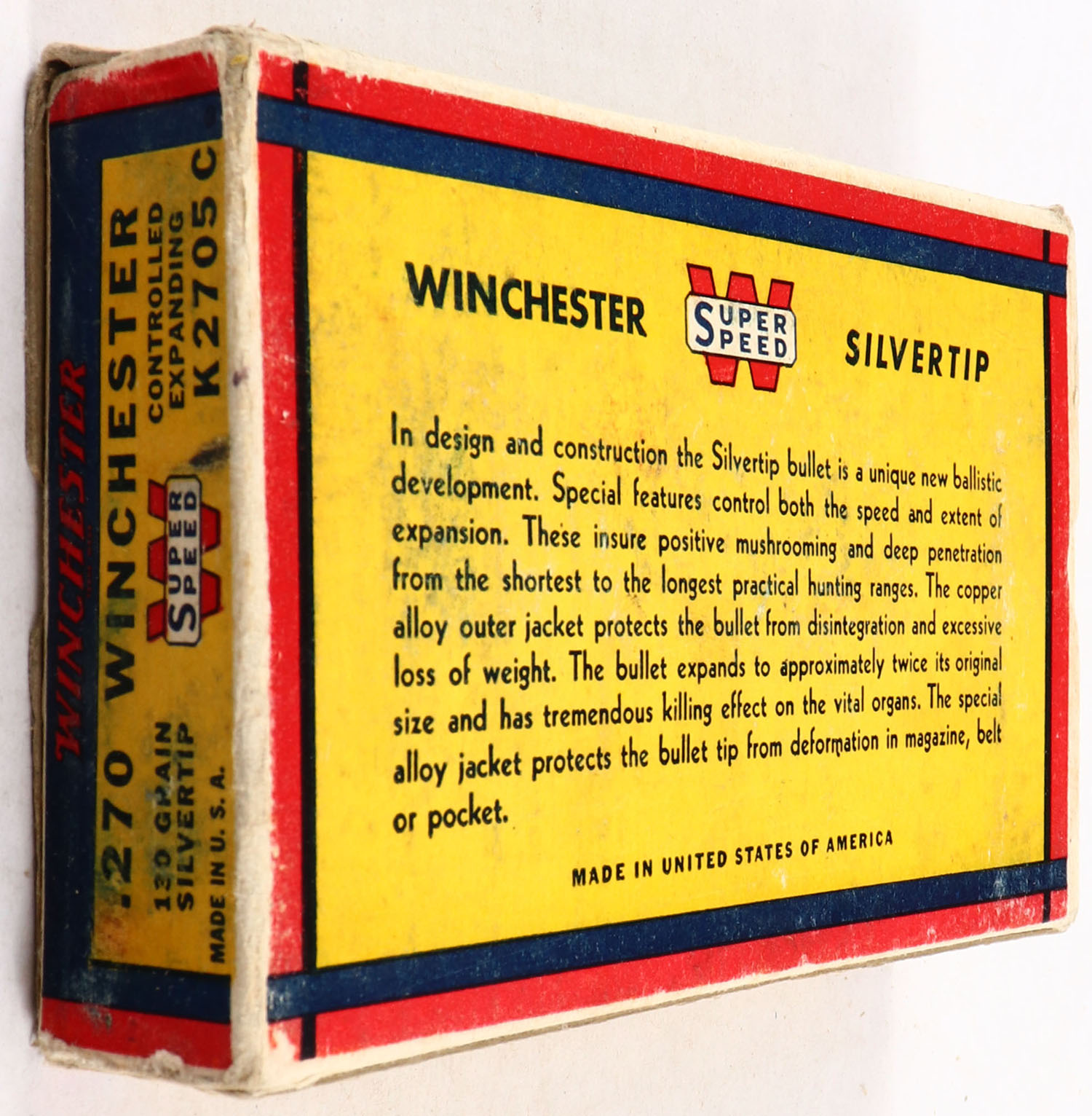 Winchester, Silvertip, .270 Winchester, 130 Grain Controlled Expanding Bullet, Full, 1pc. Yellow blue & red bear box, box is solid with excellent color, minor shelf wear, very minor staining on top, some edge & corner wear, end flaps are solid, ammo is excellent. Grade: Excellent - Value: 40 to 120