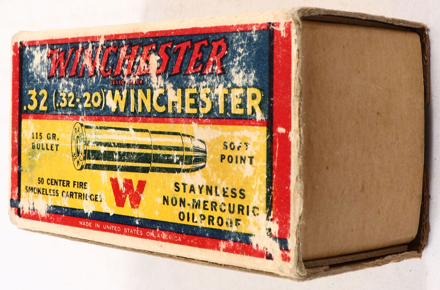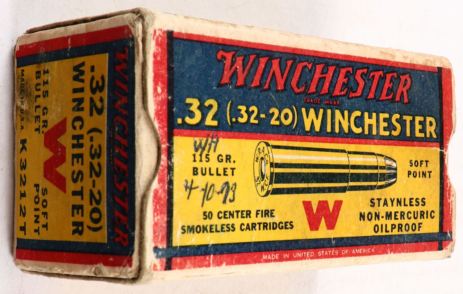 Winchester, Smokeless Cartridges, .32 Winchester (.32-20), 115 Gr. Soft Point Bullet, Full, 1pc. Yellow blue & red box, right end flap is torn off, excellent color, very minor color fading, some edge & corner wear, top has been written on, left end flap is solid, ammo is very good. Grade: Good ++ - Value: 30 to 90