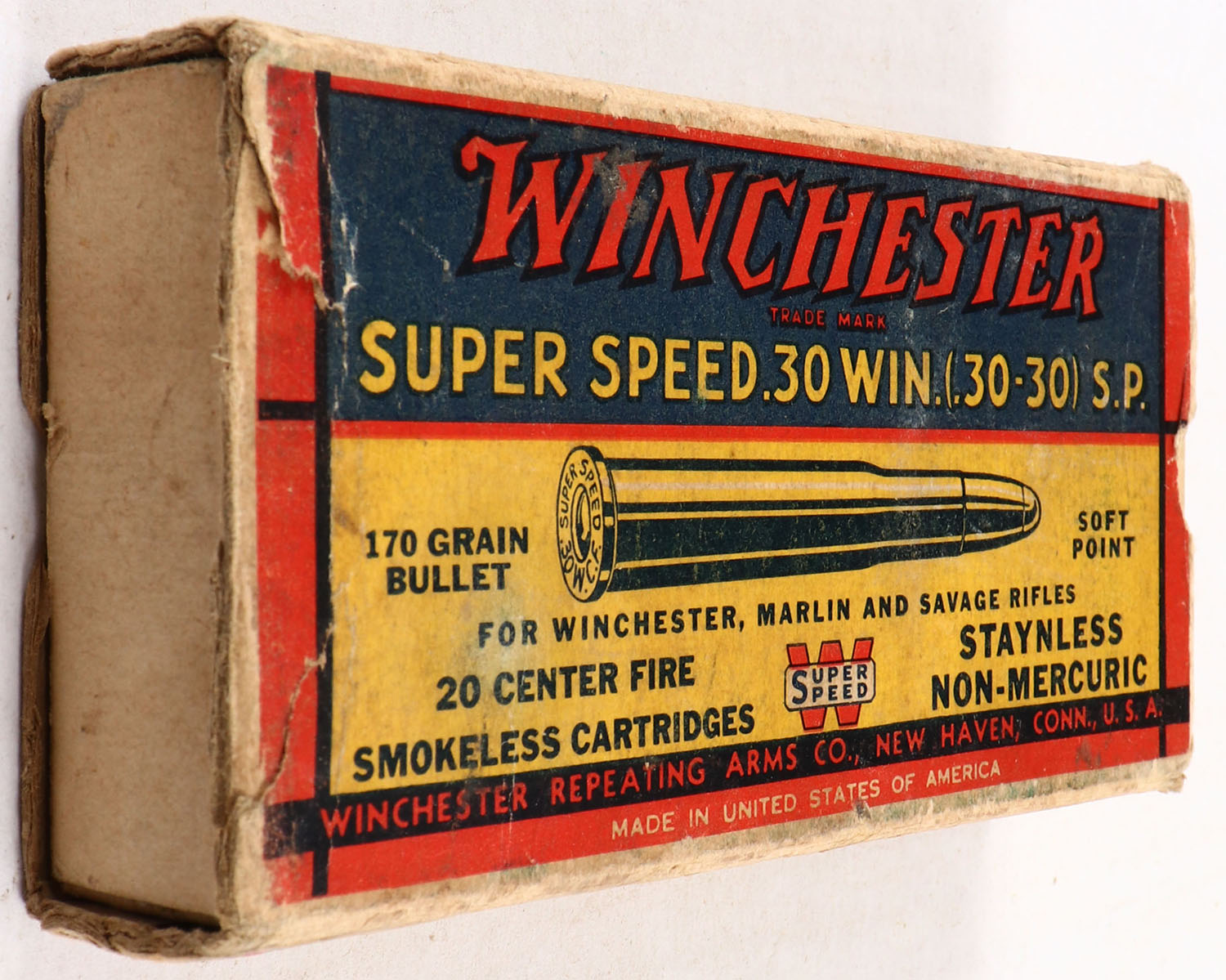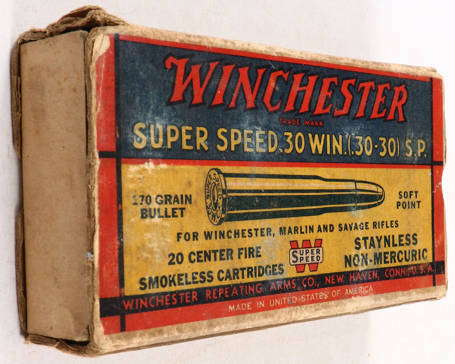 Winchester, Super Speed, .30 Winchester (.30-30), 170 Grain Soft Point Bullet, Partial 10 correct rounds, 1pc. Yellow blue & red box, box is missing both end flaps, very good color, some age soiling & shelf wear, some edge & corner wear, ammo is excellent. Grade: Good - Value: 8 to 40