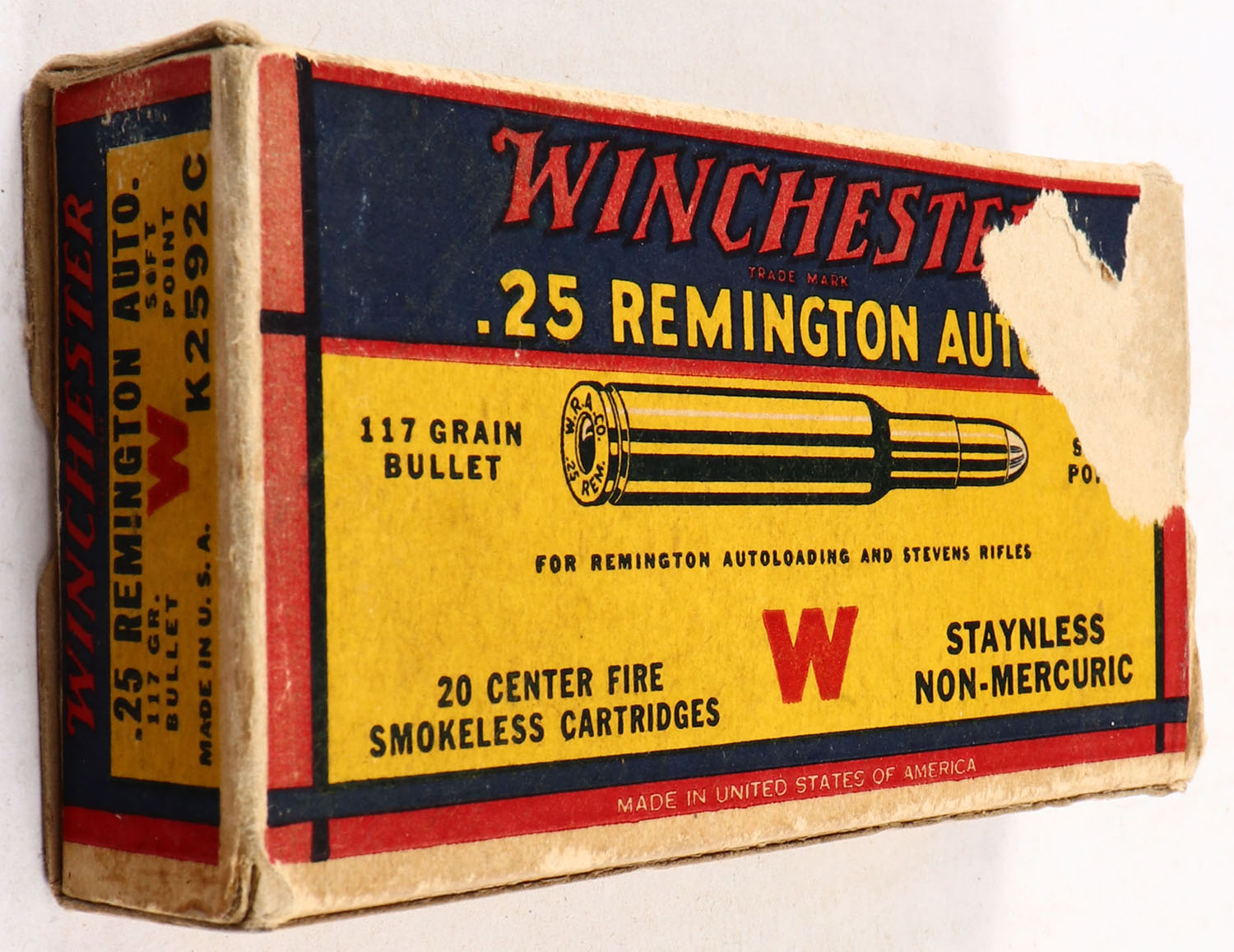 Winchester, Staynless Non-Mercuric, .25 Remington Auto., Full, 1pc. Yellow blue & red box, left end flap is torn, very good to excellent color, some color fading, minor edge & corner wear, right end flap is solid, ammo is excellent. Grade: Very Good + - Value: 40 to 120