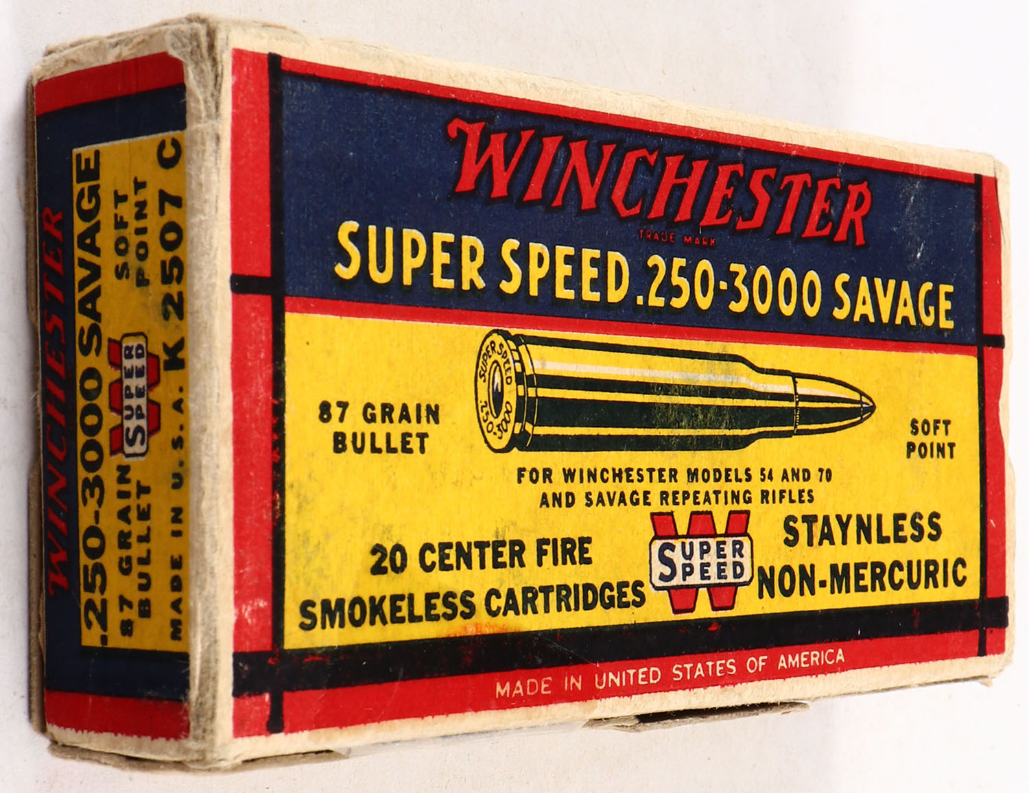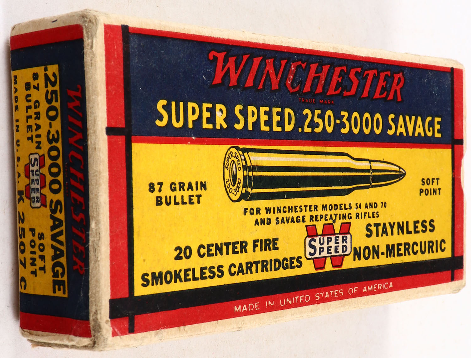 Winchester, Super Speed, 250-3000 Soft Point, 87 Grain Bullet, Full of mixed ammo, 1pc. Yellow blue & red box, box is solid with very good color, some age soiling, shelf wear, very minor corner wear, has tape repair, end flaps are solid, ammo is good. Grade: Very Good - Value: 30 to 90