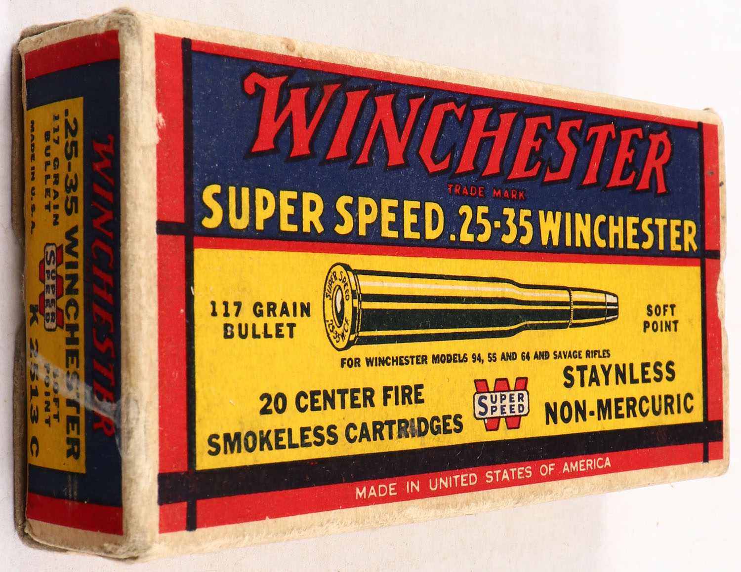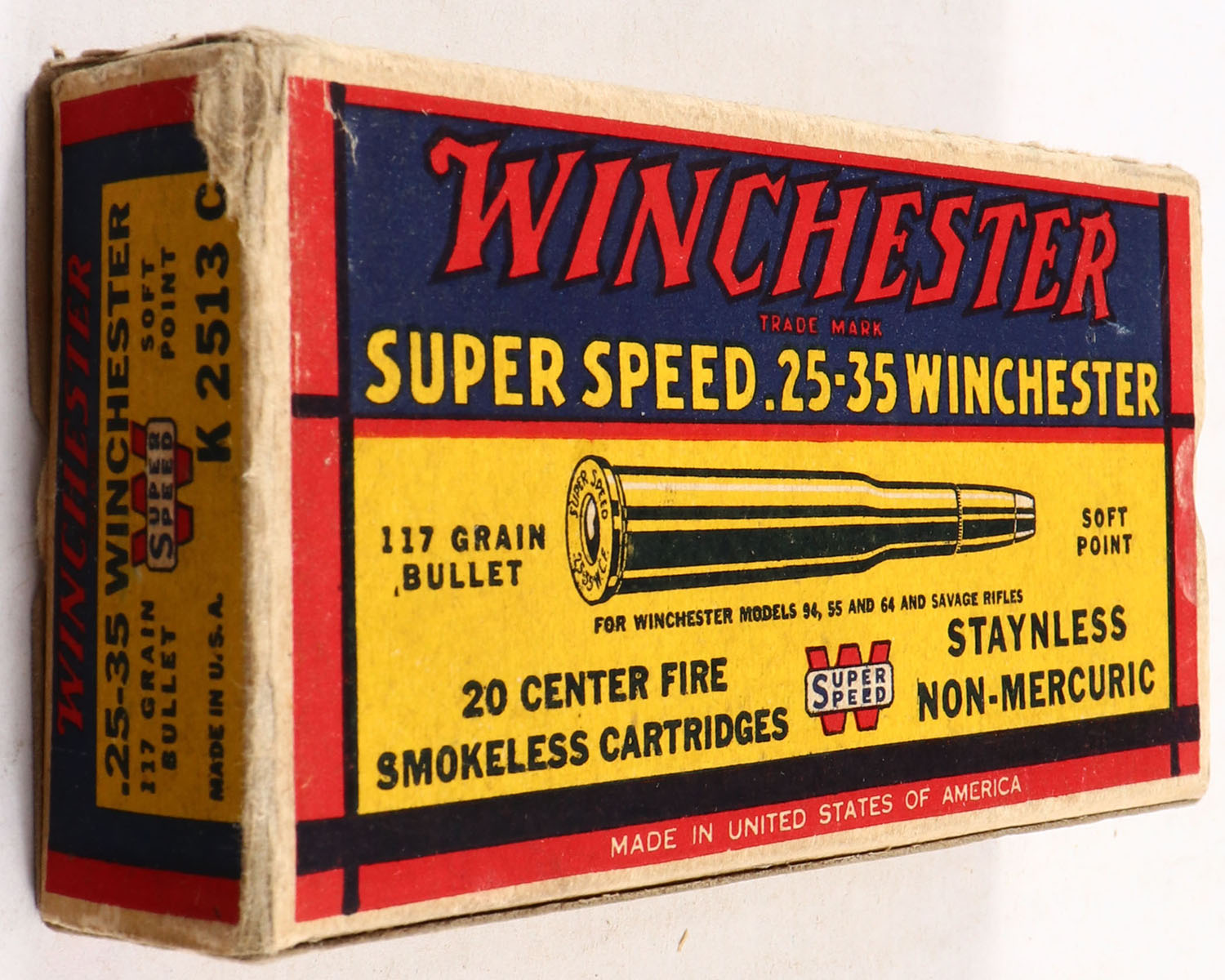 Winchester, Super Speed, .25-35 Winchester, 117 Grain Soft Point Bullet, Full, 1pc. Yellow blue & red box, box is solid with excellent color, very minor age soiling, very minor corner wear, edges are mostly crisp, end flaps are solid, ammo is excellent. Grade: Excellent + - Value: 50 to 150