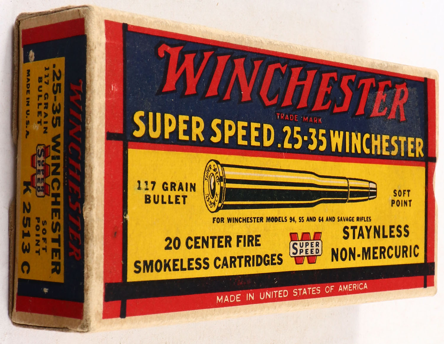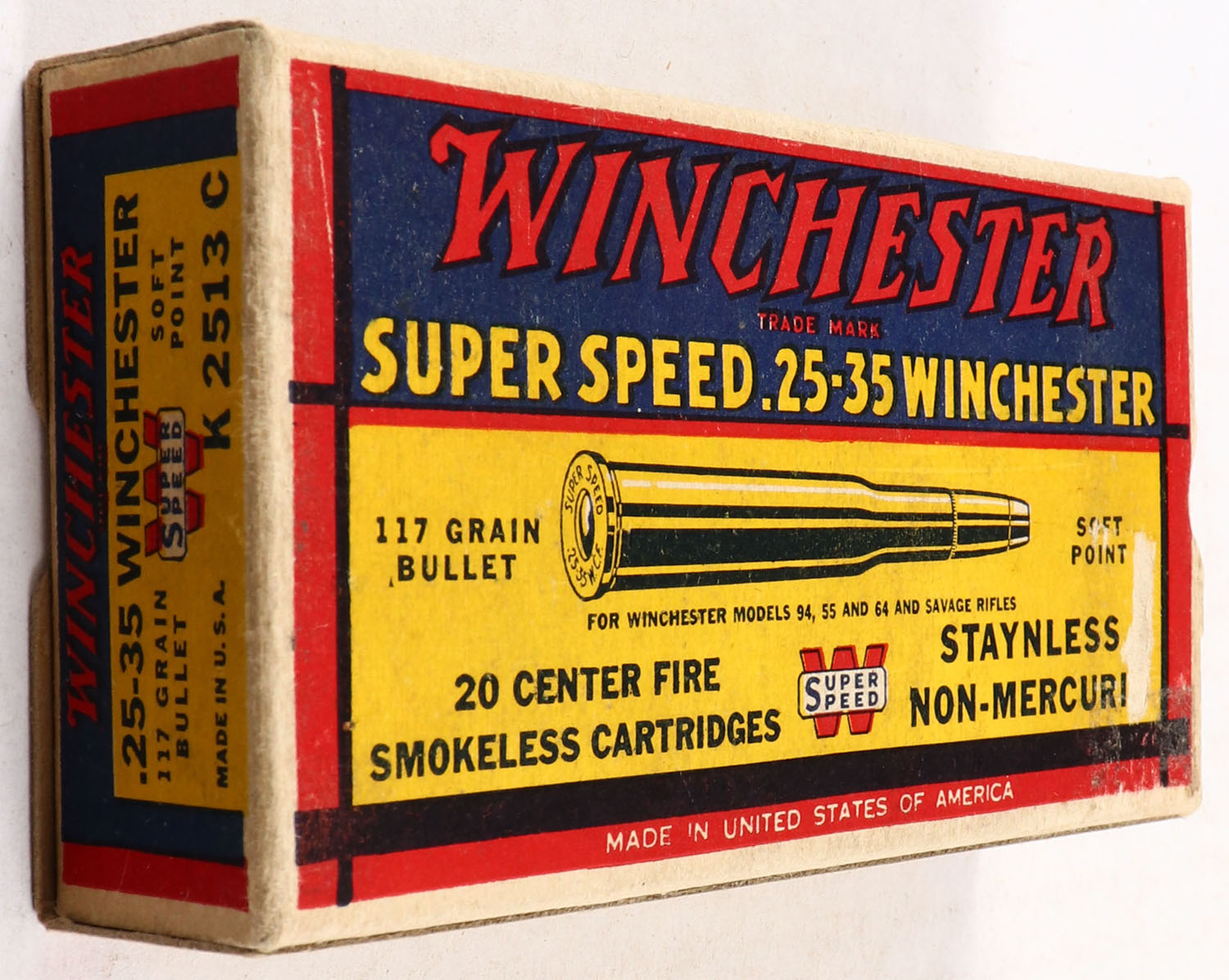 Winchester, Super Speed, .25-35 Winchester, 117 Grain Soft Point Bullet, Full, 1pc. Yellow blue & red box, box is solid with excellent color, very minor age soiling, very minor corner wear, edges are mostly crisp, end flaps are solid, ammo is excellent. Grade: Excellent + - Value: 50 to 150