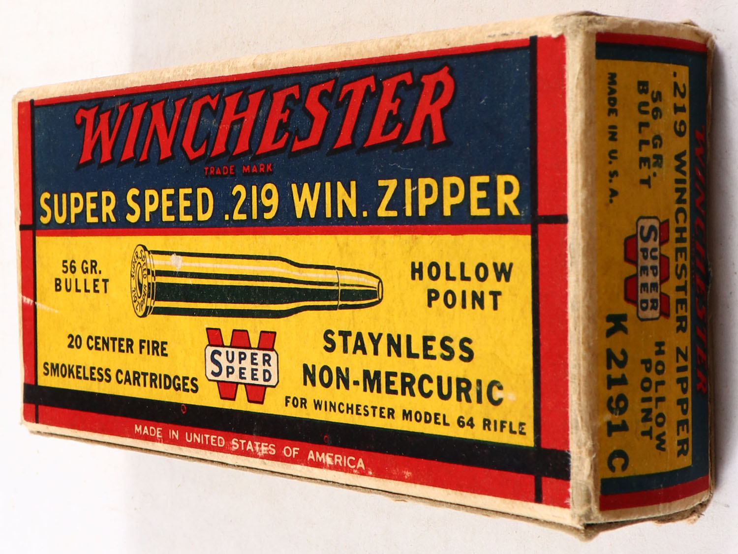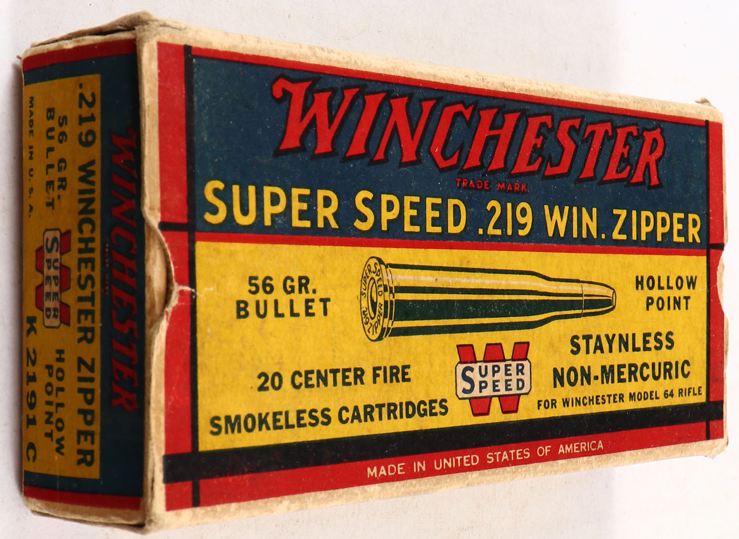 Winchester, Super Speed, .219 Win. Zipper, 56 Grain Hollow Point Bullet, Full, 1pc. Yellow blue & red box, box is solid with excellent color, minor age soiling & corner wear edges are mostly crisp, end flaps are solid, ammo is excellent. Grade: Excellent - Value: 100 to 300