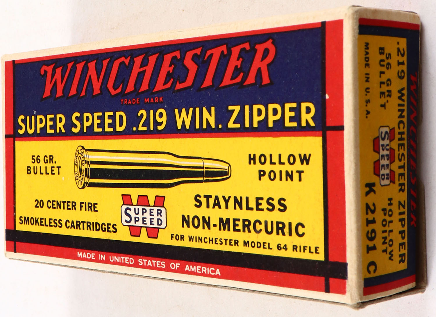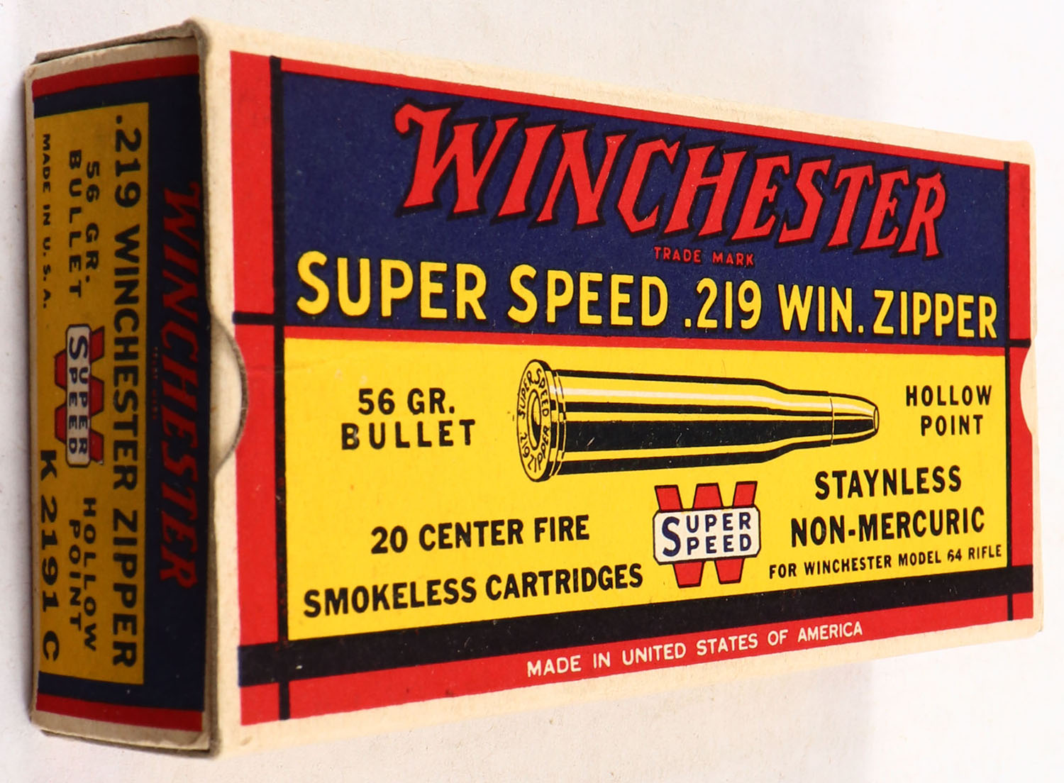 Winchester, Super Speed, .219 Win. Zipper, 56 Grain Hollow Point Bullet, Full, 1pc. Yellow blue & red box, box is near mint with minty color, only very minor corner wear, edges are crisp, end flaps are solid, ammo is excellent. Grade: Excellent ++ - Value: 150 to 450