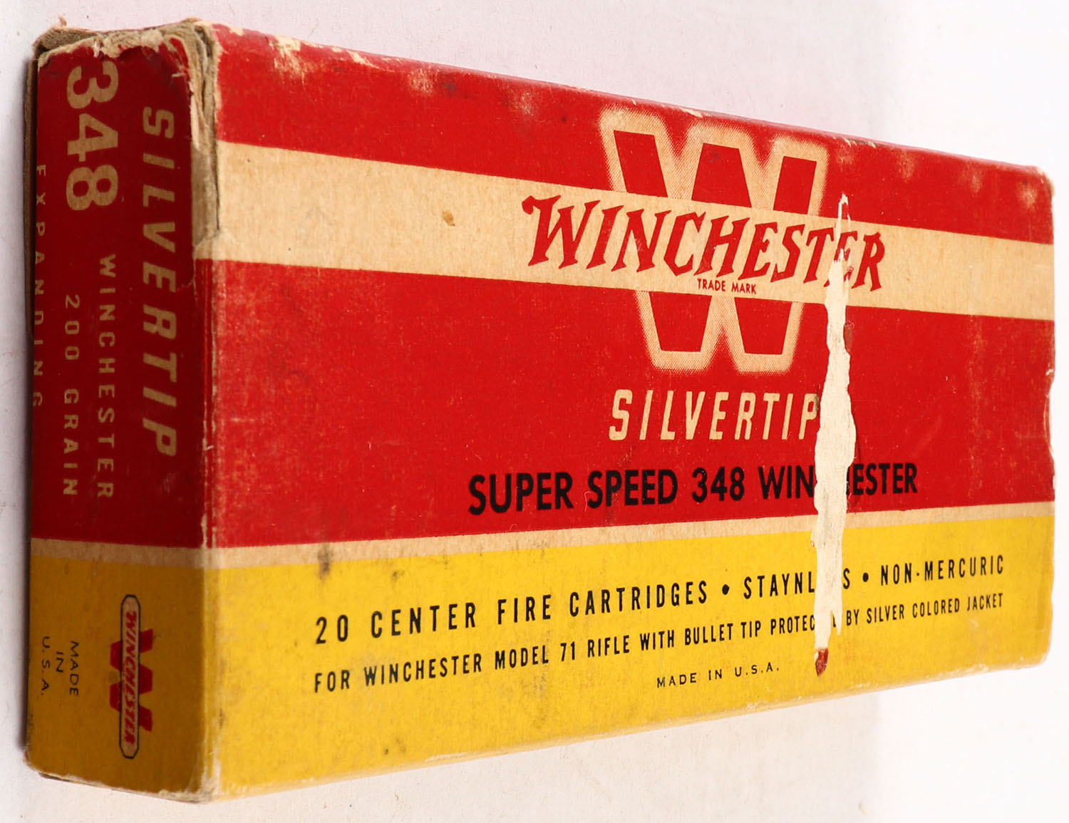 Winchester, Silvertip, .348 Winchester, 200 Grain Controlled Expanding Bullet, Full, 1pc. Red yellow & white box, box is solid with excellent color, box has age soiling and scuffing, has edge & corner wear, end flaps are solid, ammo is excellent. Grade: Very Good ++ - Value: 50 to 150