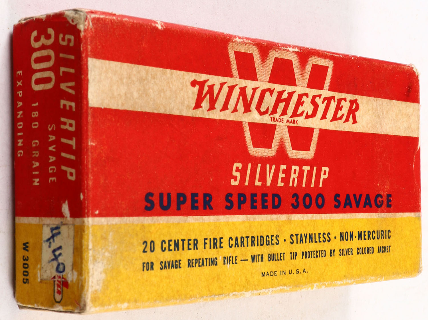 Winchester, Silvertip, .300 Savage, 180 Grain Controlled Expanding Full, 1pc. Red yellow & white box, box is solid with very good color, some age soiling, minor shelf & corner wear, very minor edge wear, end flaps are solid, ammo is excellent. Grade: Very Good ++ - Value: 30 to 90