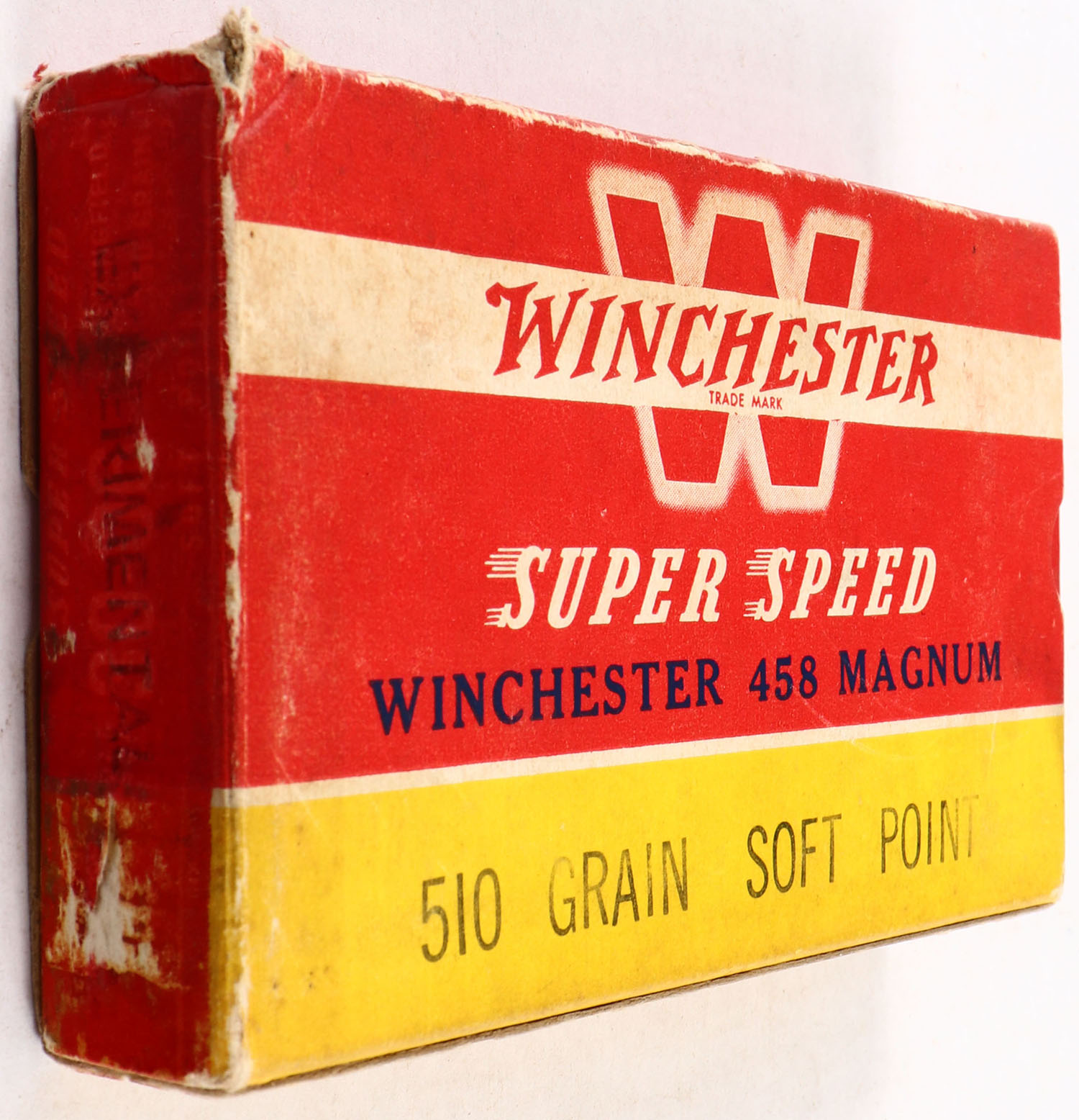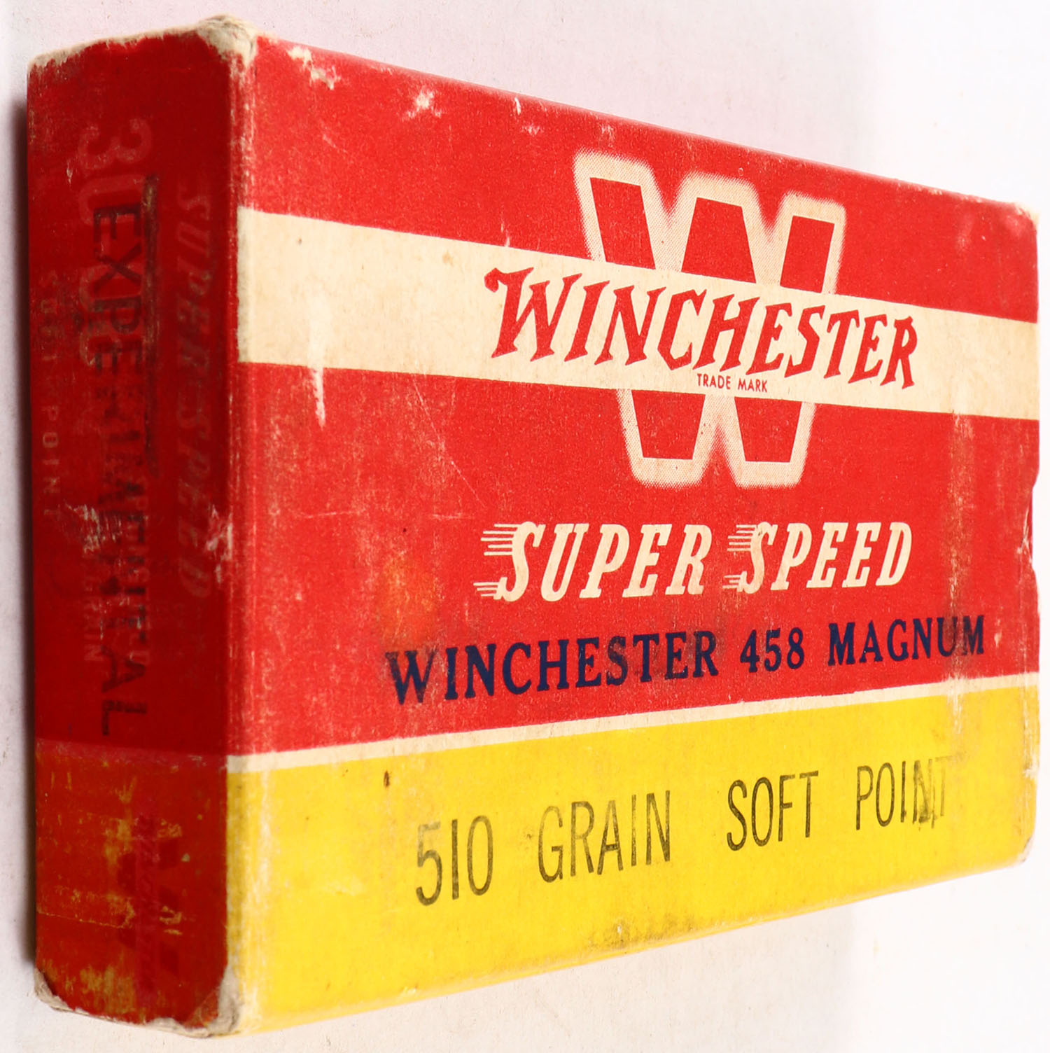 Winchester, Super Speed, .458 Winchester Mag., 510 Grain Full Soft Point, Full, 1pc. ''Experimental Box'' Giles book page 273, Red white & orange box, box is solid with very good color, minor age soiling, some shelf & corner wear, very minor edge wear, end flaps are solid, ammo is excellent. Grade: Very Good + - Value: 50 to 200
