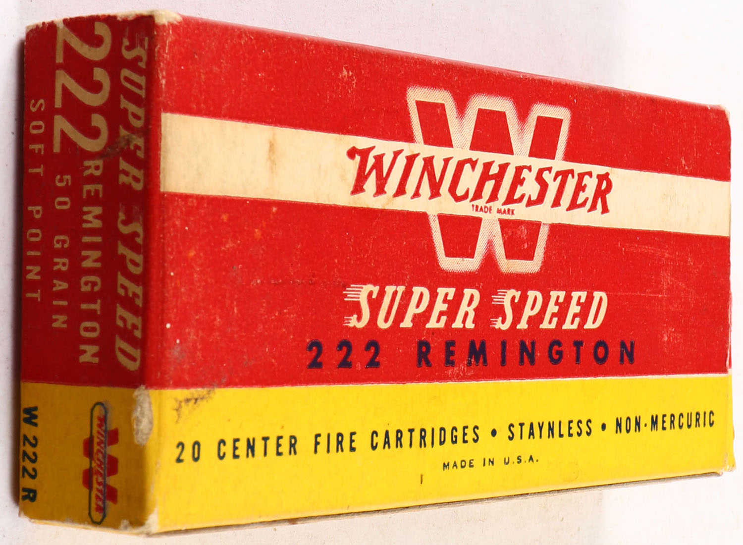 Winchester, Super Speed, .222 Remington, 50 Grain Soft Point, Full, 1pc. Red yellow & white box, box is solid with very good to excellent color, very minor age soiling & shelf wear, minor edge & corner wear, end flaps are solid, ammo is excellent. Grade: Excellent + - Value: 16 to 60