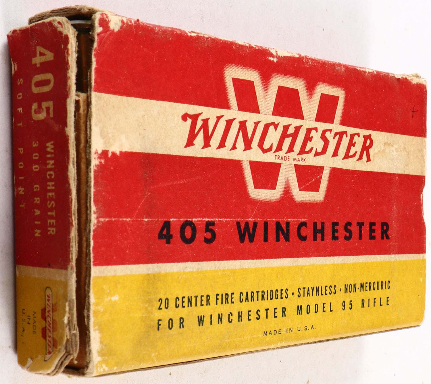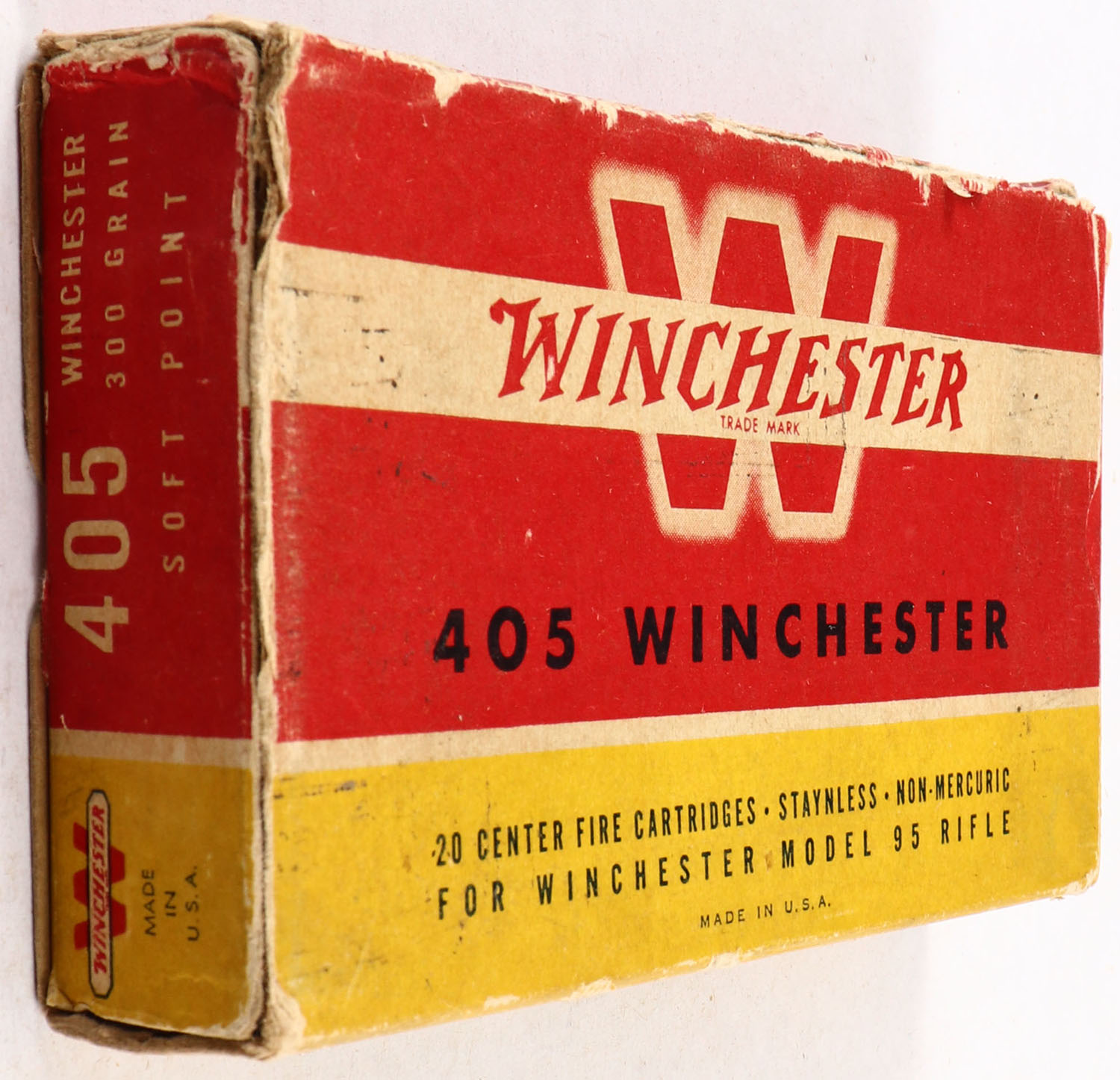Winchester, .405 Winchester, 300 Grain Soft Point, Full, 1pc. Red yellow & white box, both end flaps are torn, very good color, some age soiling & corner wear, minor shelf & edge wear, ammo is excellent. Grade: Good + - Value: 50 to 150