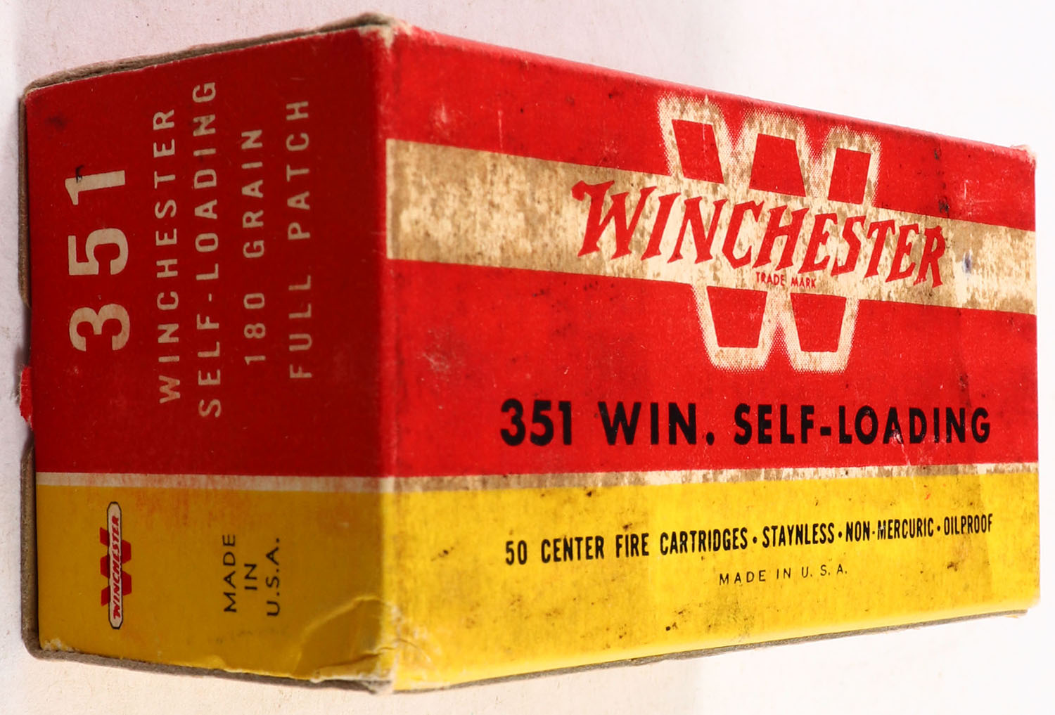 Winchester, .351 Win. Self-Loading, 180 Grain Soft Point, Full, 1pc. Red yellow & white box, box is solid with very good to excellent color, minor age soiling, very minor shelf wear, minor edge & corner wear, end flaps are solid, ammo is excellent. Grade: Excellent + - Value: 80 to 160