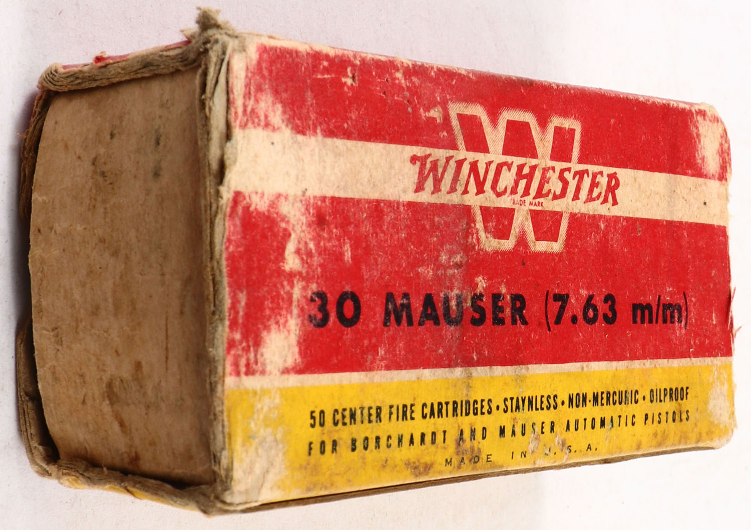 Winchester, .30 Mauser (7.63 mm), 86 Grain Full Patch, Full, 1pc. Red yellow & white box, missing both end flaps, good to very good color, age soiling & staining, corner wear, some edge wear, ammo is very good. Grade: Good - Value: 10 to 40