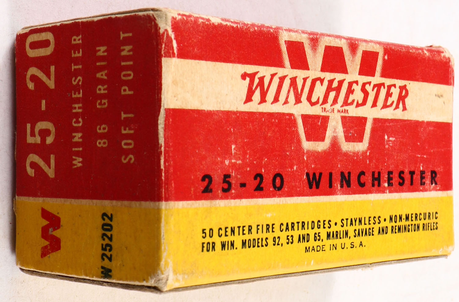 Winchester, .25-20 Winchester, 86 Grain Soft Point, Full, 1pc. Red yellow & white box, box is solid with excellent color, box has light age soiling & scuffing, very minor corner and edge wear, insert tab of left end is missing, right end flap is solid, ammo is excellent. Grade: Excellent - Value: 100 to 250