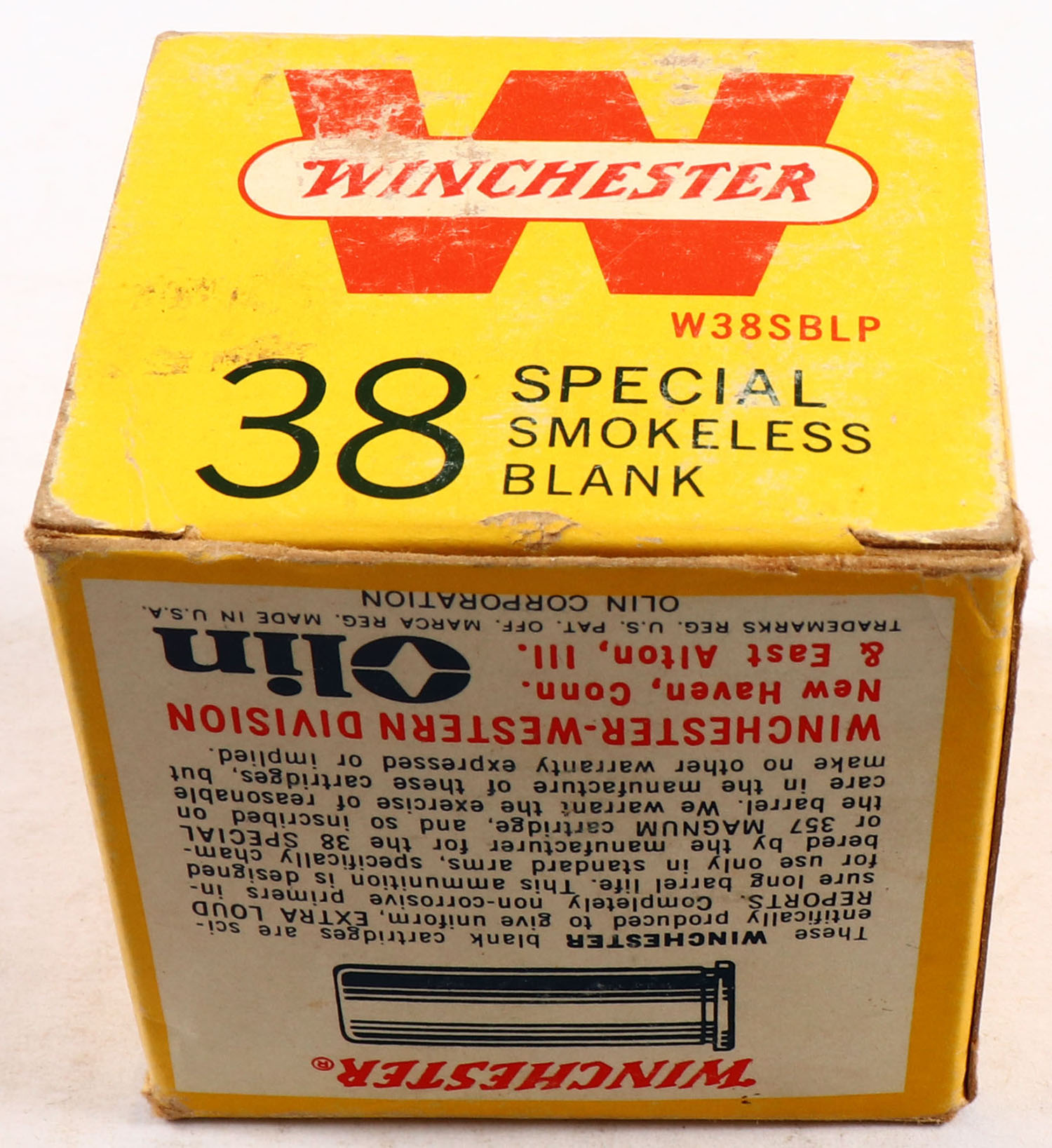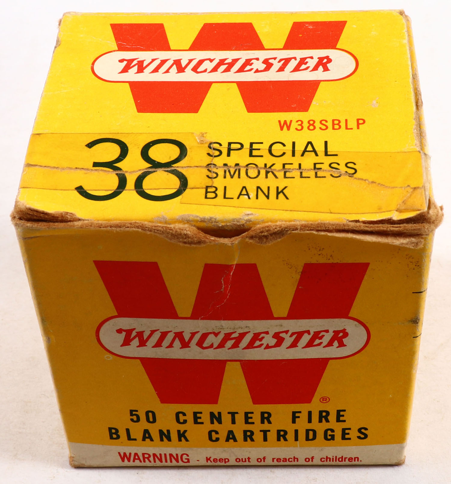 Winchester, Blank Cartridges, .38 Special, Full, 1pc. Yellow white & red box, box is solid with excellent color, very minor age soiling, edge & corner wear, top flap is torn & taped, ammo is excellent. Grade: Very Good + - Value: 4 to 20