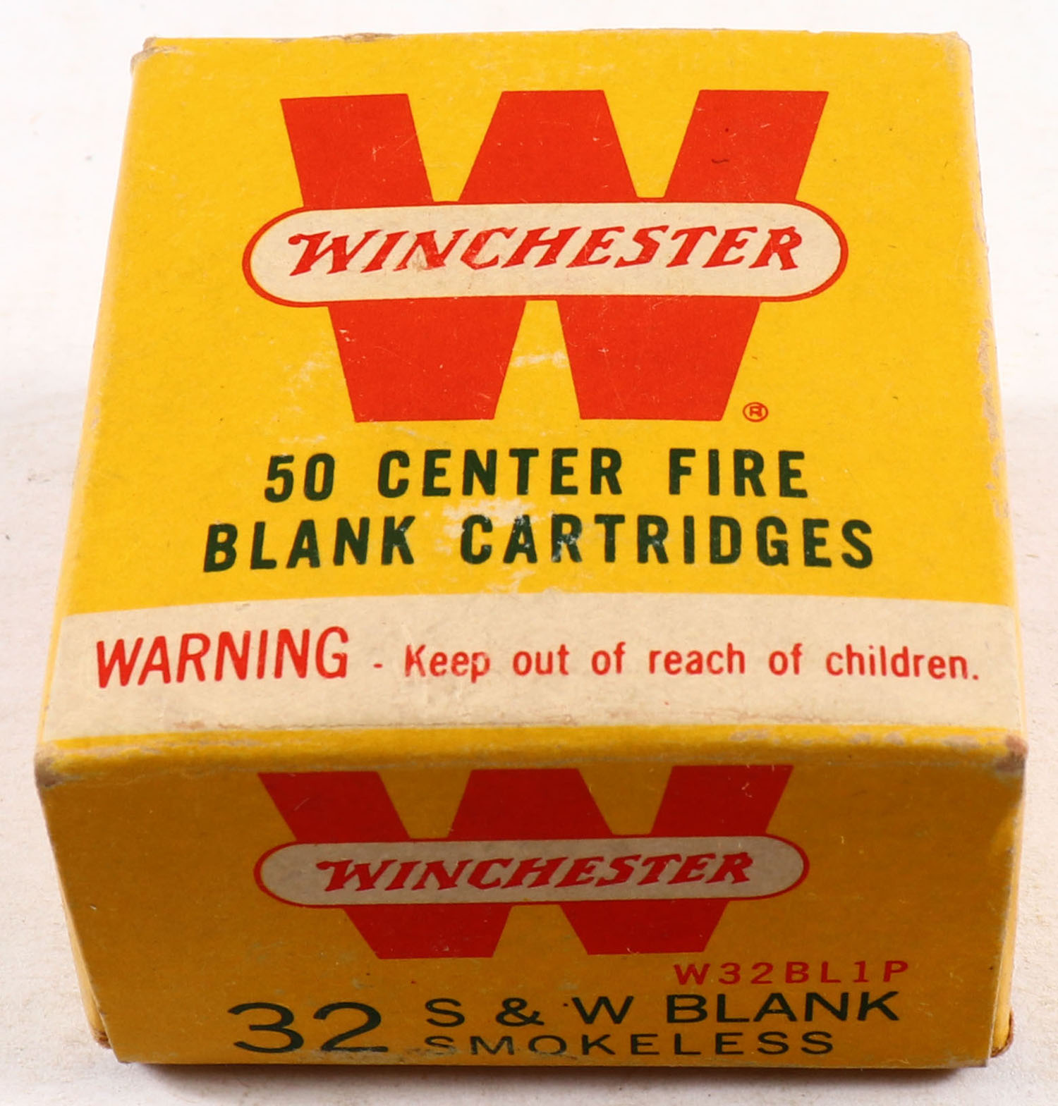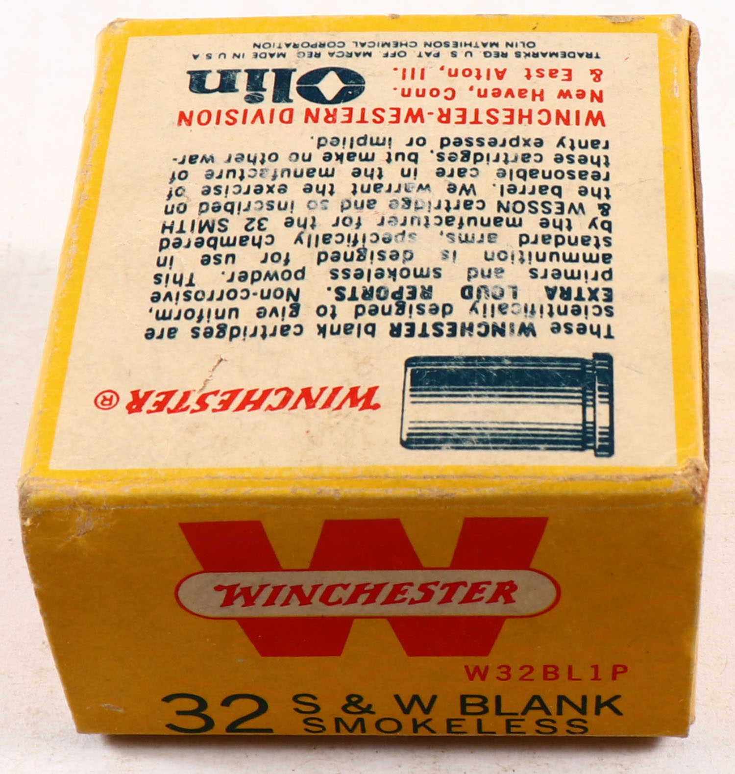 Winchester, Blank Cartridges, .32 Smith & Wesson, Smokeless Powder, Full, 1pc. Yellow red & white box, box is solid with excellent color, very minor age soiling & corner wear, edges are mostly crisp, top flap is solid, ammo is excellent. Grade: Excellent - Value: 8 to 40