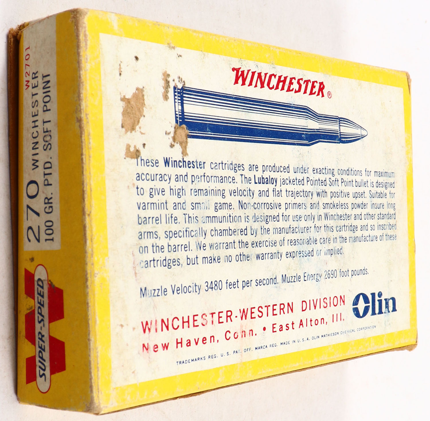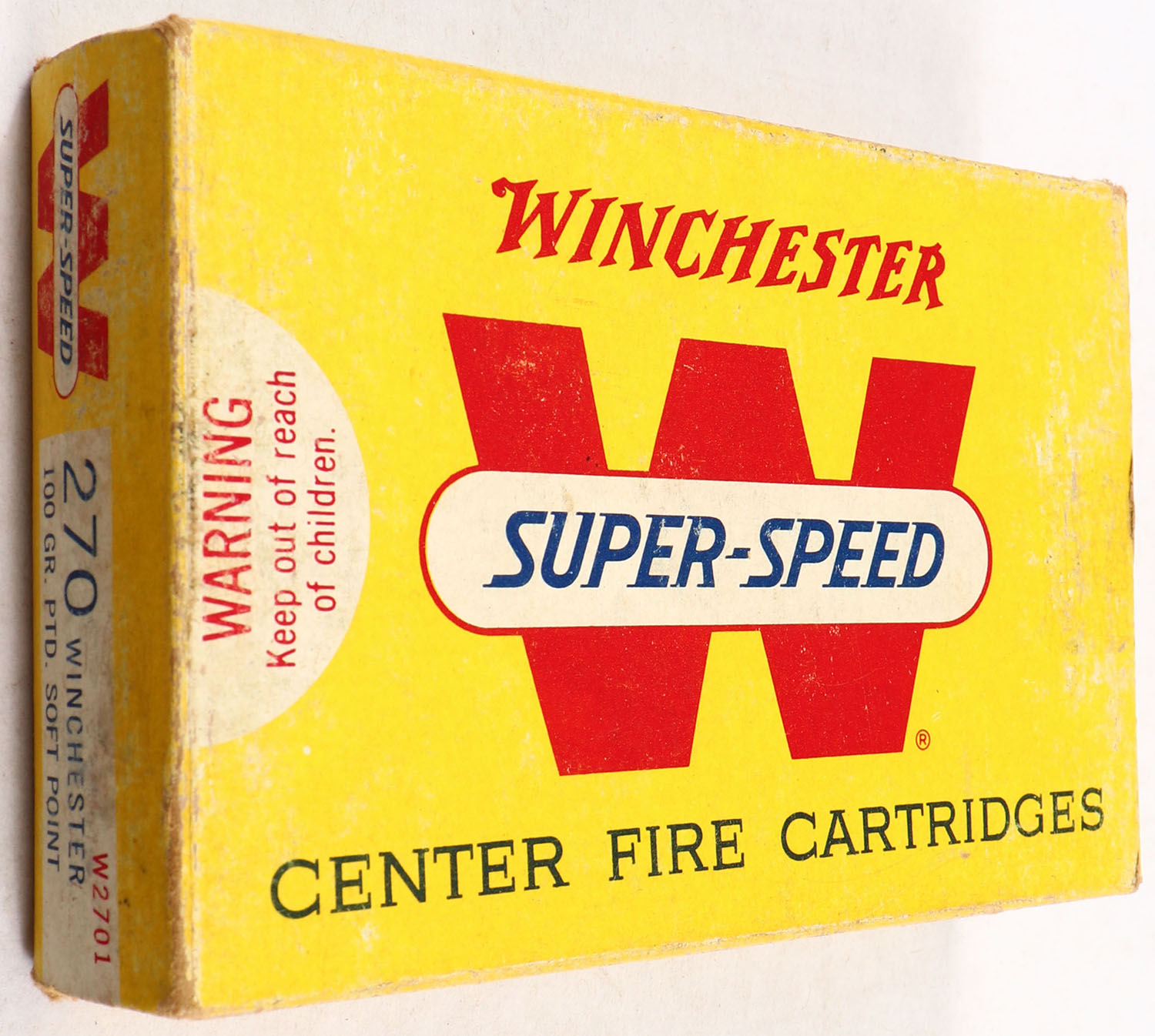 Winchester, Super-Speed, .270 Winchester, 100 Grain Soft Point, Full, 1pc. Yellow Red & white box, box is solid with very good to excellent color, minor age soiling & shelf wear, minor edge & corner wear, end flaps are solid, ammo is excellent to minty. Grade: Excellent - Value: 20 to 60