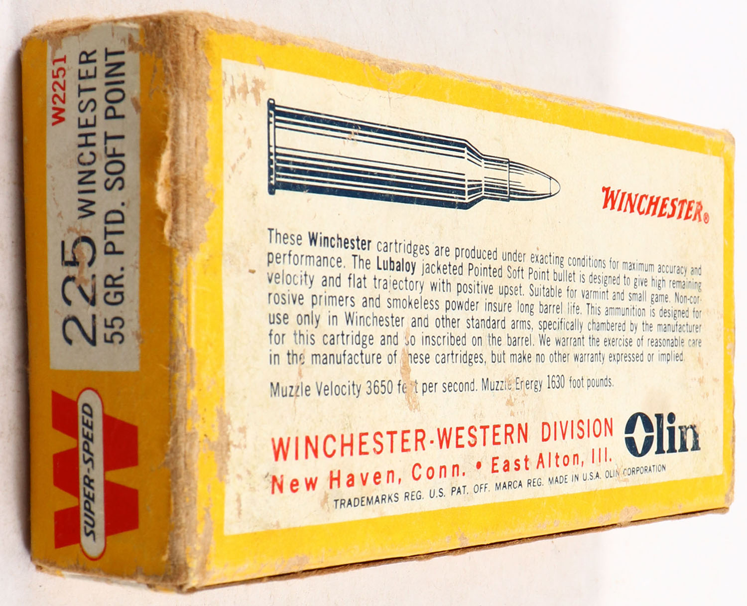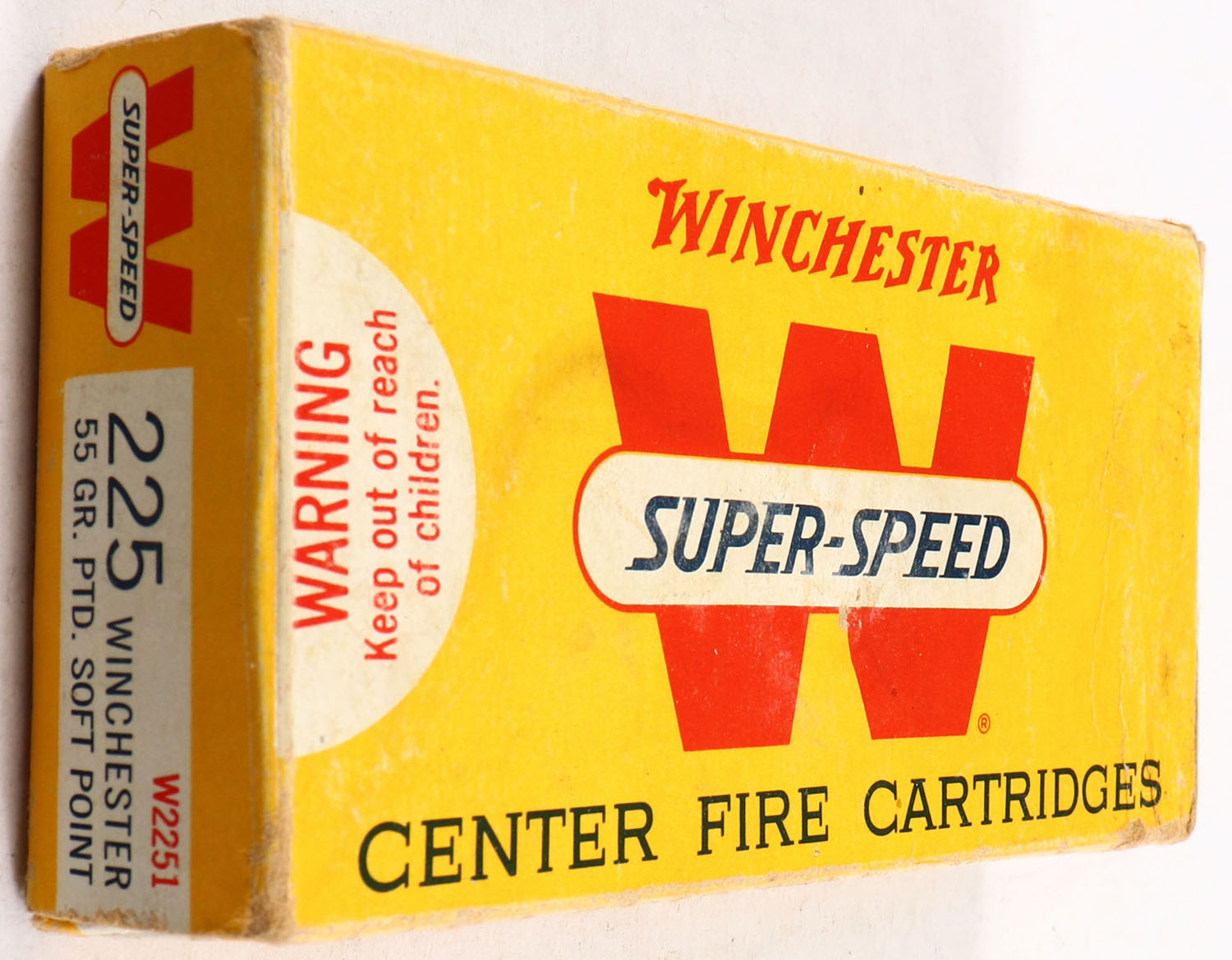 Winchester, Super-Speed, .225 Winchester, 55 Grain Pointed Soft Point, Full, 1pc. Yellow white & red box, box is solid with excellent color, has shelf wear, some edge & corner wear, end flaps are solid, ammo is excellent. Grade: Very Good - Value: 20 to 60