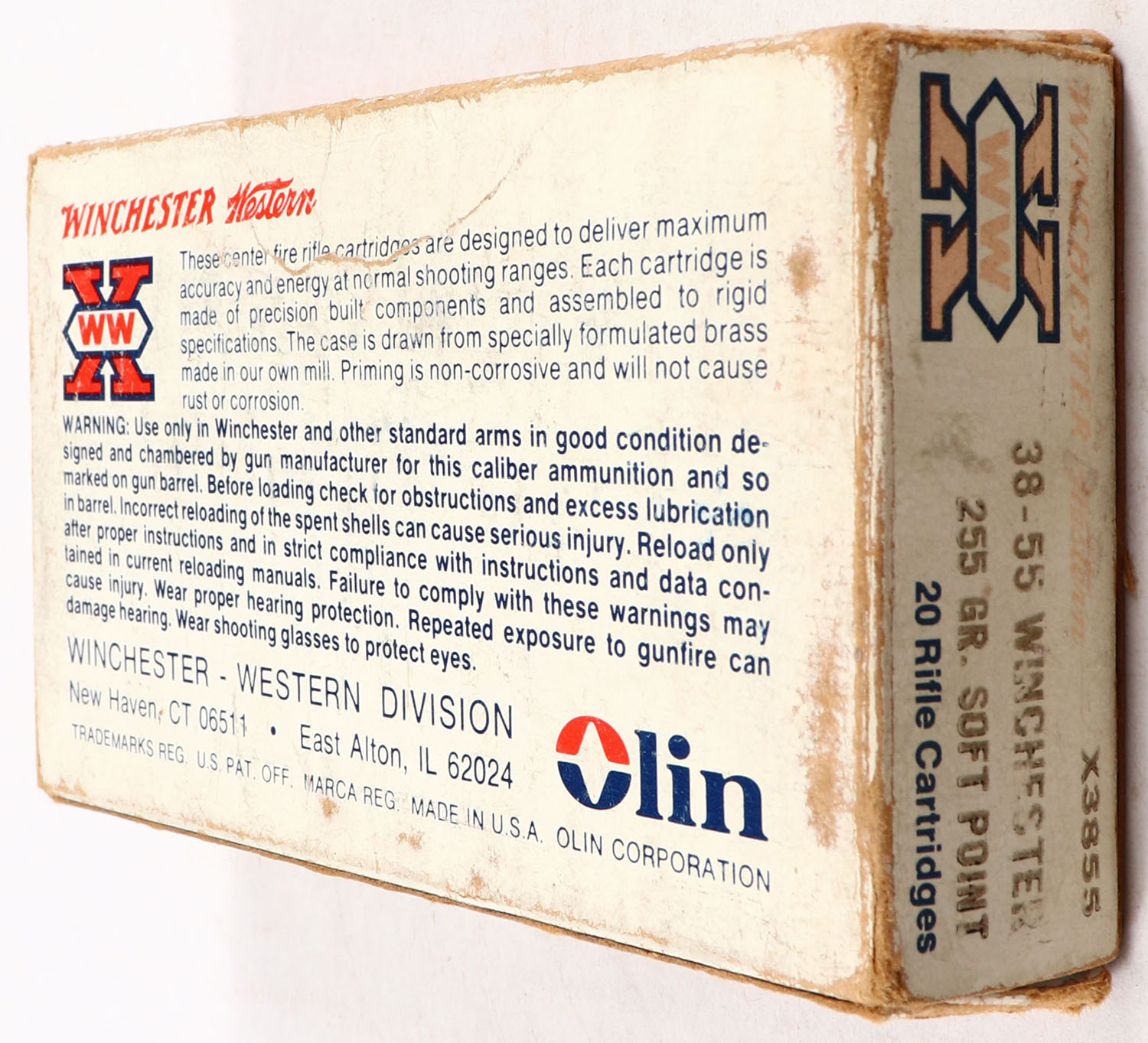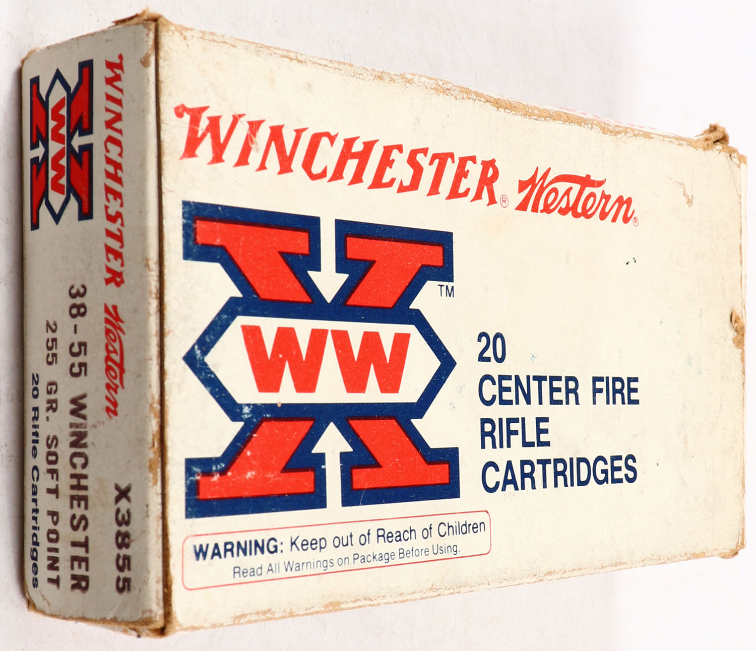 Winchester-Western, X, .38-55 WIN., 255 Gr. Soft Point, Full, 1pc. White & red box, box is solid with good color, box has shelf & corner wear, very minor edge wear, end flaps are solid, ammo is very good. Grade: Very Good - Value: 30 to 90