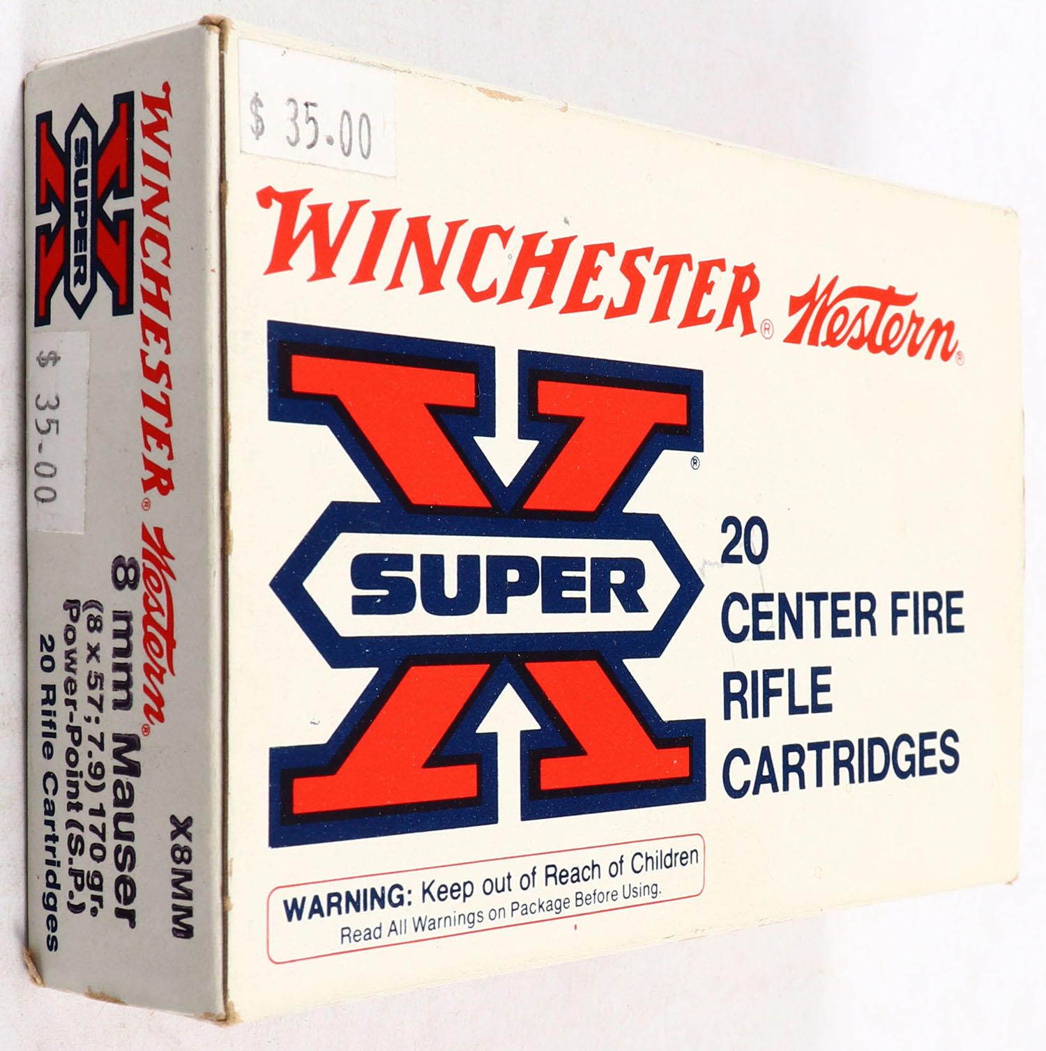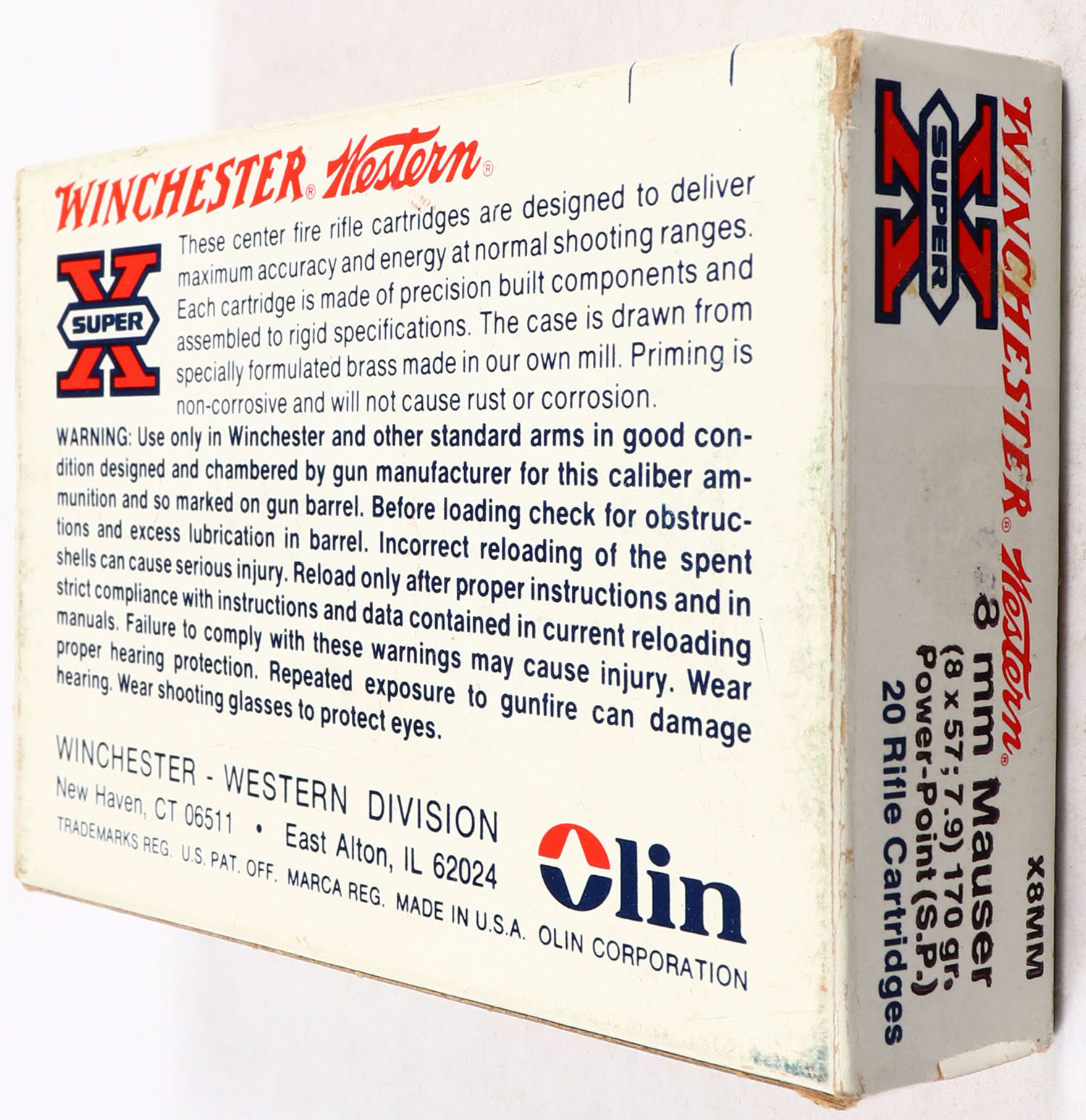 Winchester, Super-X, 8mm Mauser (8X57;7.9), 170 Gr. Power Point Bullet, 1pc, Full, white box with red/black print, box is solid with excellent color, ammo is excellent. Grade: Excellent - Value: 20 to 60