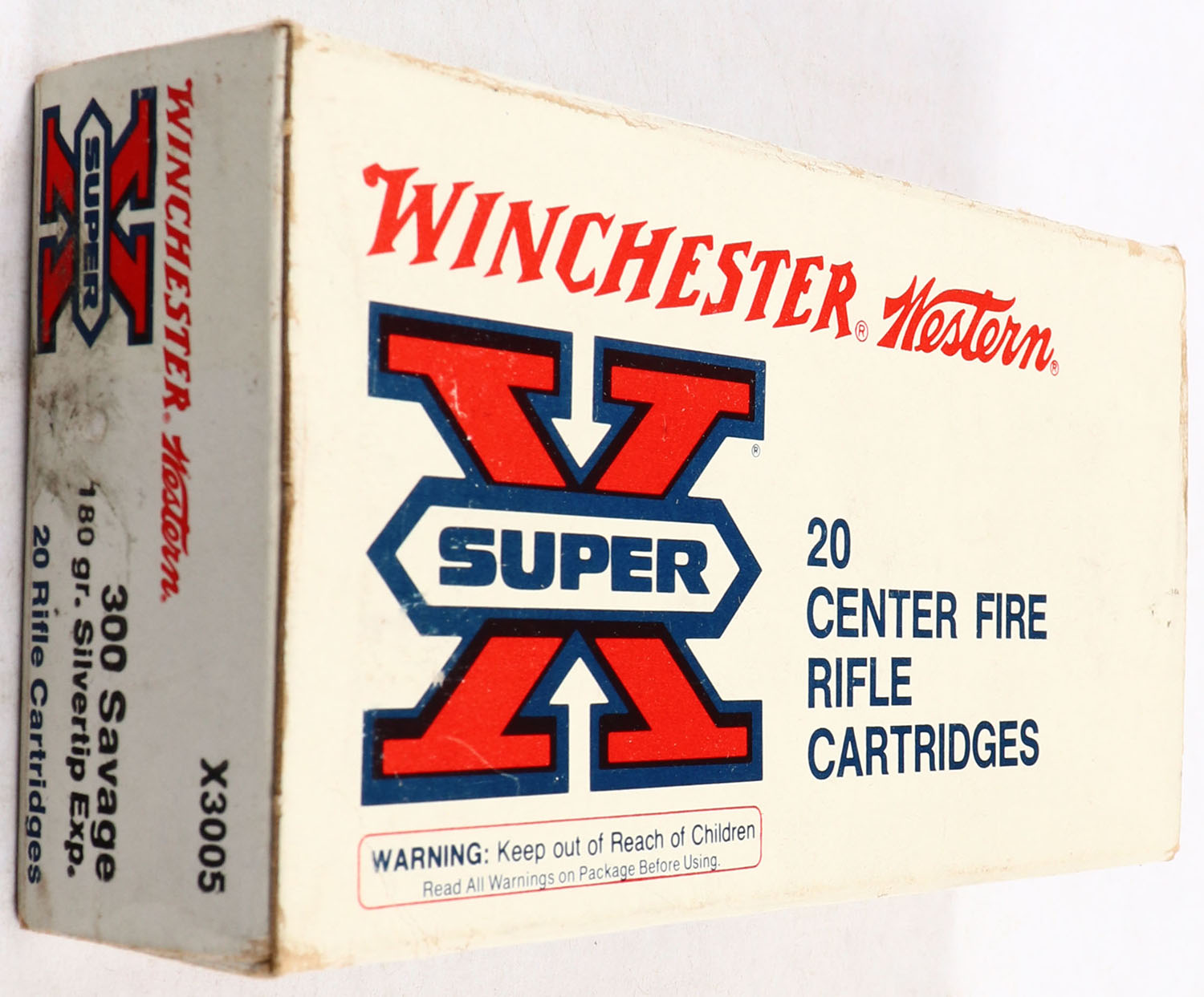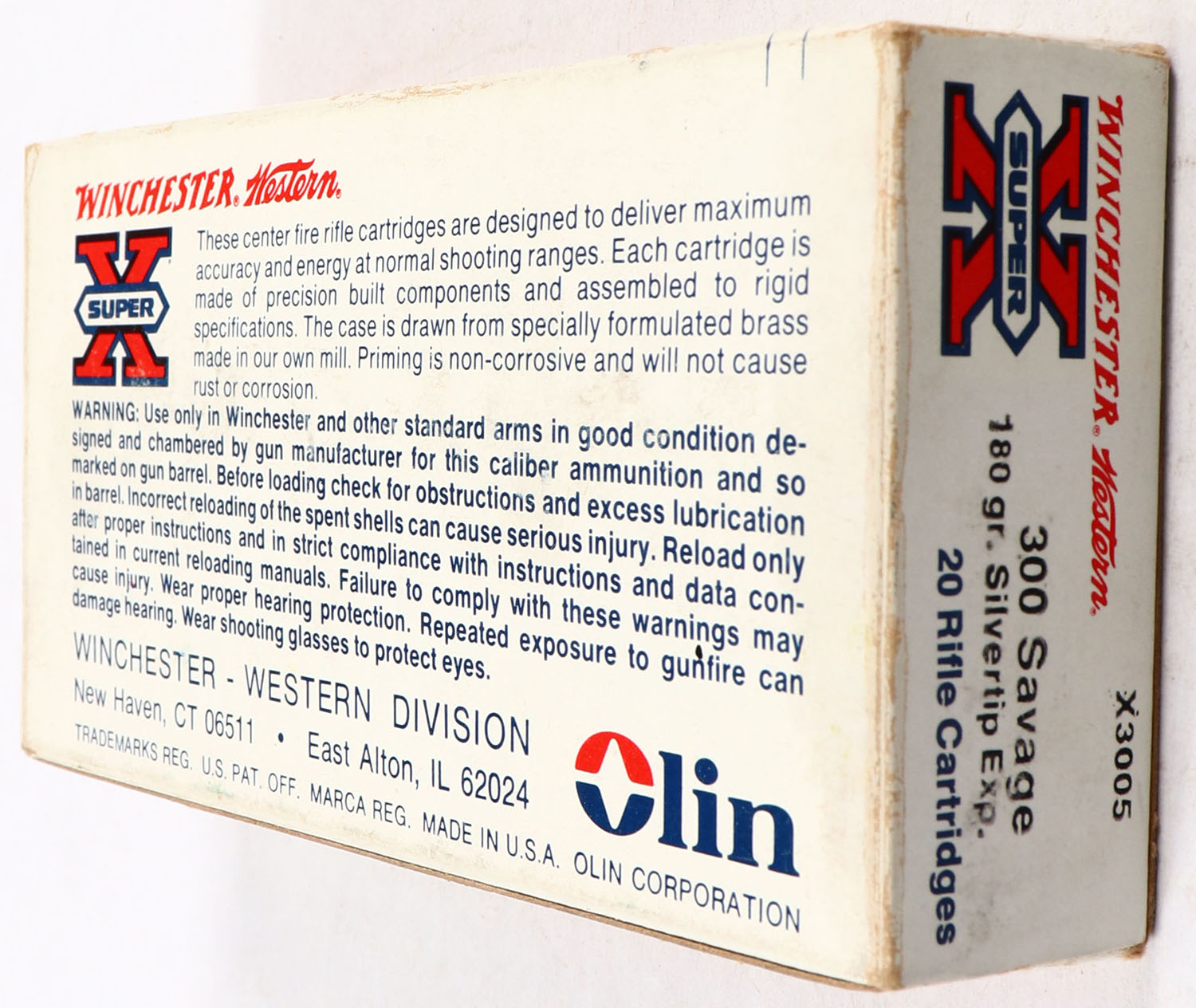 Winchester, Super X, .300 Savage, 180 Grain Silvertip Exp., Full, 1pc. White red & blue box, box is solid with excellent color, very minor age soiling, some shelf & corner wear, edges are mostly crisp, end flaps are solid, ammo is excellent. Grade: Excellent - Value: 20 to 60