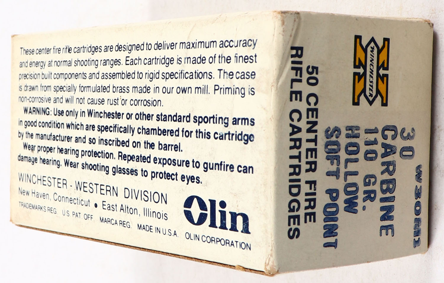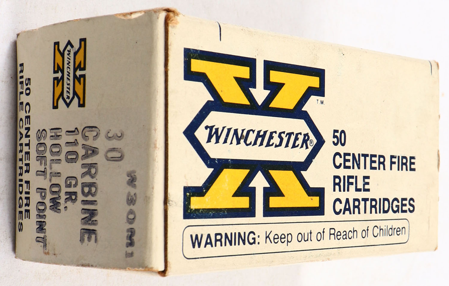 Winchester, Super X, .30 Carbine, 110 Grain Hollow Soft Point, Full, 1pc. White box, box is solid with very good color, minor age soiling & shelf wear, corners are mostly sharp, edges are crisp, end flaps are solid, ammo is excellent. Grade: Excellent + - Value: 20 to 60