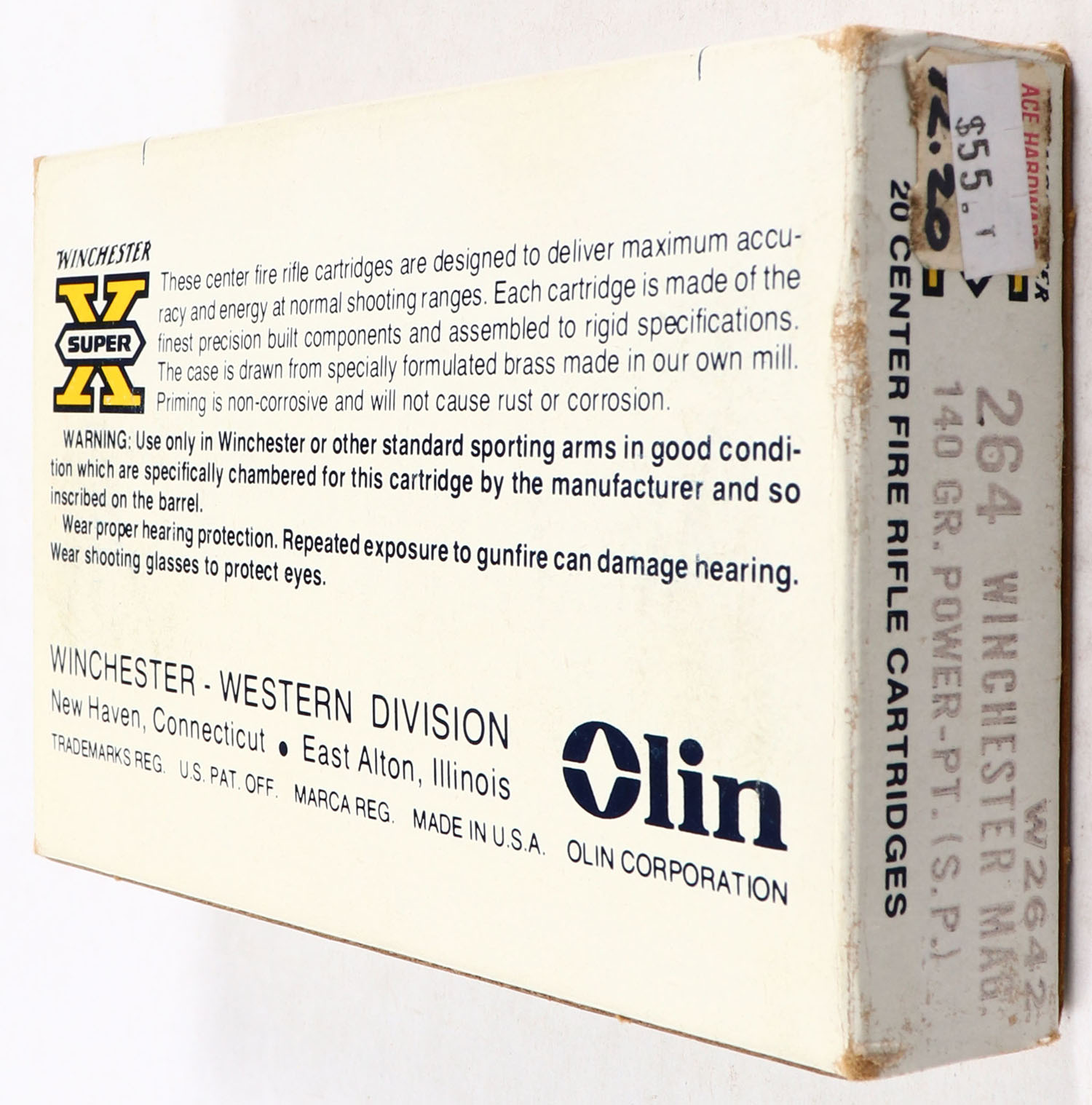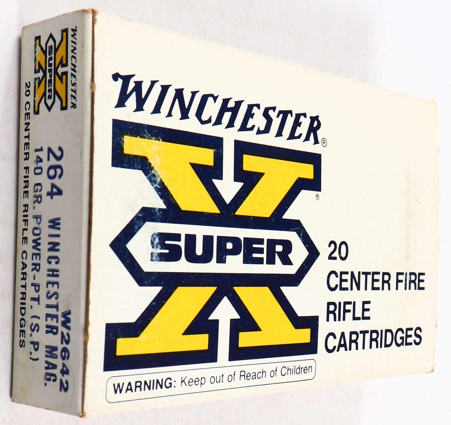 Winchester, Super X, .264 Winchester Magnum, 140 Grain Power Point, Full, 1pc. White yellow & blue box, box is solid with very good color, light age soiling & shelf wear, very minor corner wear, edges are mostly crisp, end flaps are solid, ammo is excellent. Grade: Excellent - Value: 30 to 90