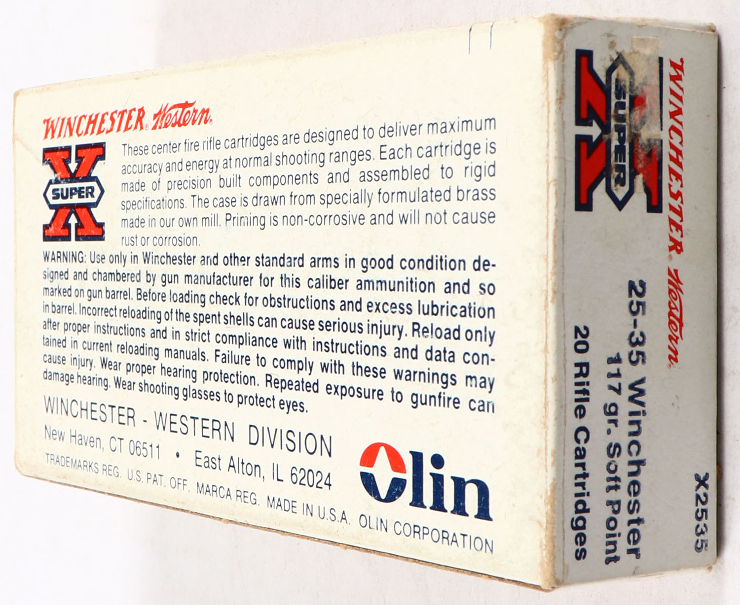 Winchester-Western, Super-X, .25-35 Winchester, 117 Grain Soft Point, Full, 1pc. White & red box, box is solid with excellent color, minor shelf wear, very minor corner wear, edges are crisp, end flaps are solid, stain on top, ammo is excellent. Grade: Excellent - Value: 50 to 150