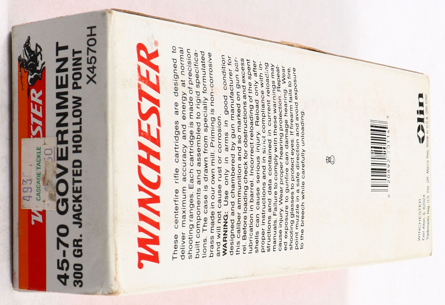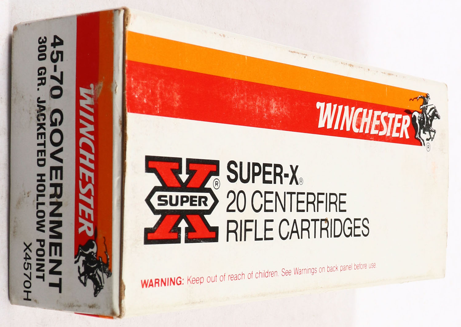 Winchester, Super-X, .45-70 Winchester, 300 Grain Jacketed H.P., Full, 1pc., Multi-colored box, box is solid with excellent color, ammo is excellent. Grade: Excellent + - Value: 20 to 80