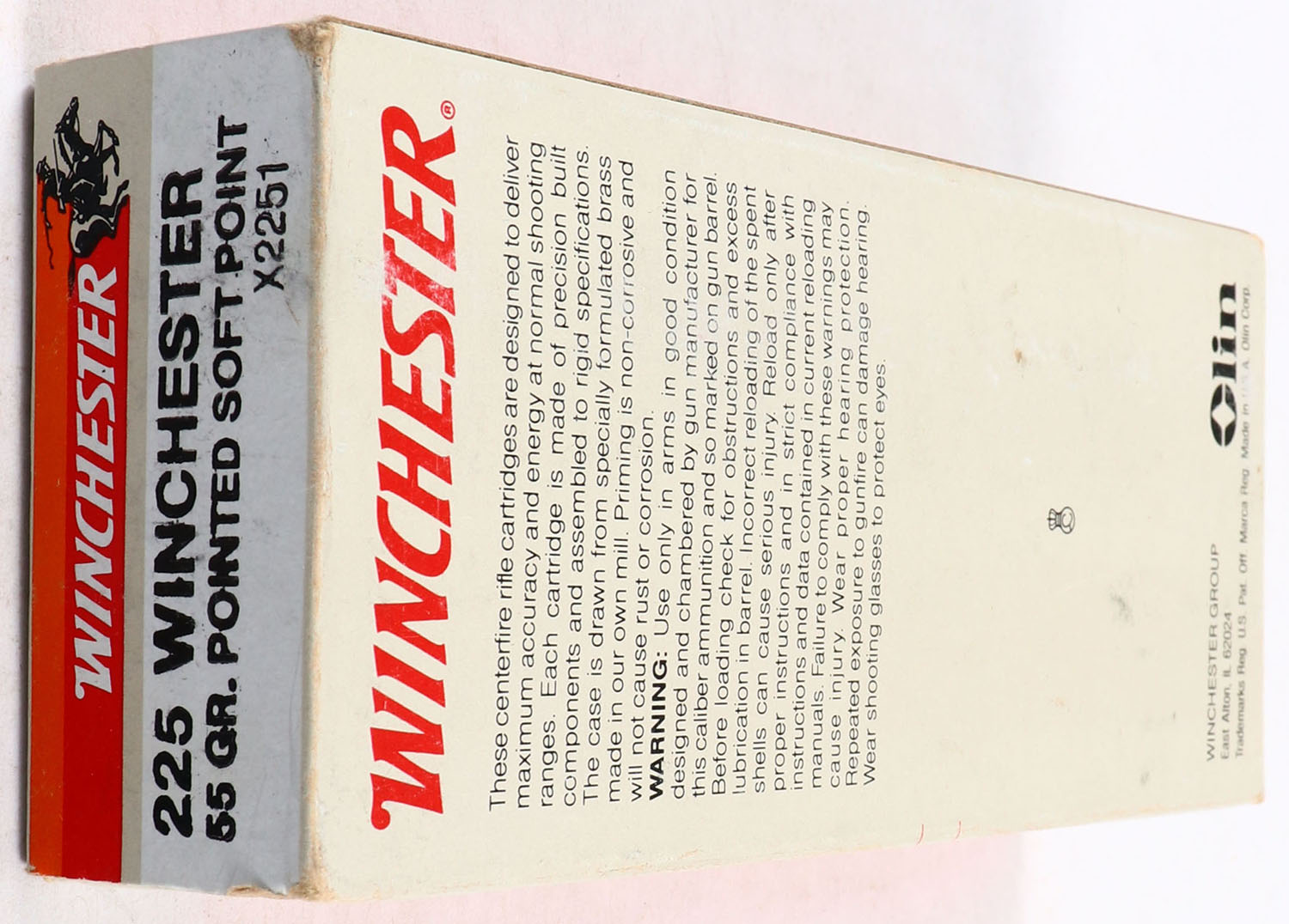 Winchester, Super X, .225 Winchester, 55 Grain Pointed Soft Point, Full, 1pc. White red & orange box, box is solid with excellent color, minor shelf wear, minor edge & corner wear, end flaps are solid, ammo is excellent. Grade: Excellent - Value: 20 to 60