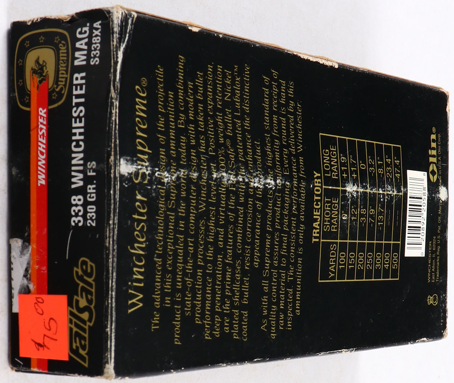 Winchester, Supreme FailSafe, .338 Win. Mag., 1pc, Full, 230Gr FS, S338XA, Black box with gold, white, orange & red print, box is solid with light rub marks, handling marks & sticker on right end flap, ammo is excellent. Grade: Excellent - Value: 50 to 150