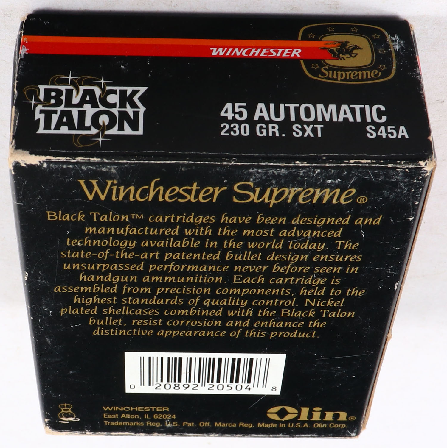 Winchester, Black Talon, .45 Automatic, 230 Grain SXT, Partial 17rds correct., 1pc. Black red & orange box, box is solid with good color, has edge & corner wear with light scuffing, end flaps are solid, ammo is very good. Grade: Very Good ++ - Value: 30 to 90