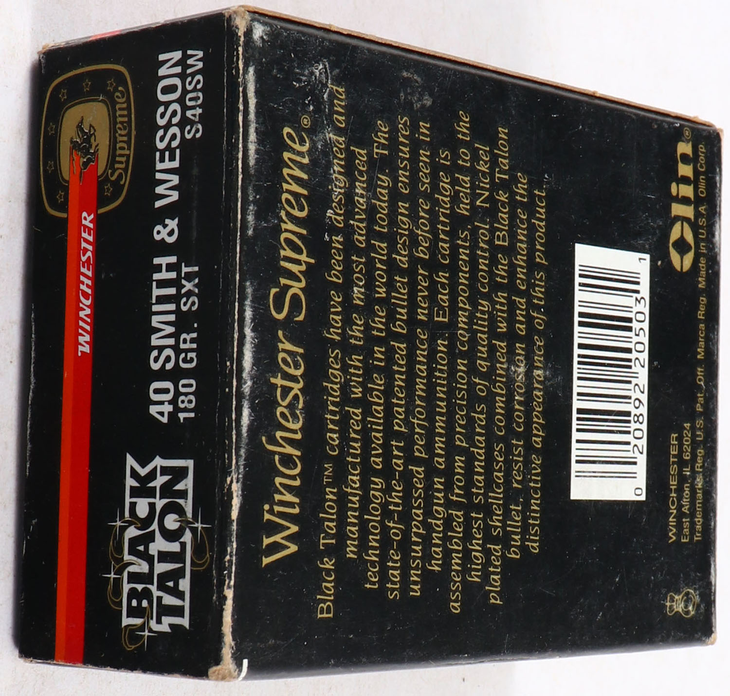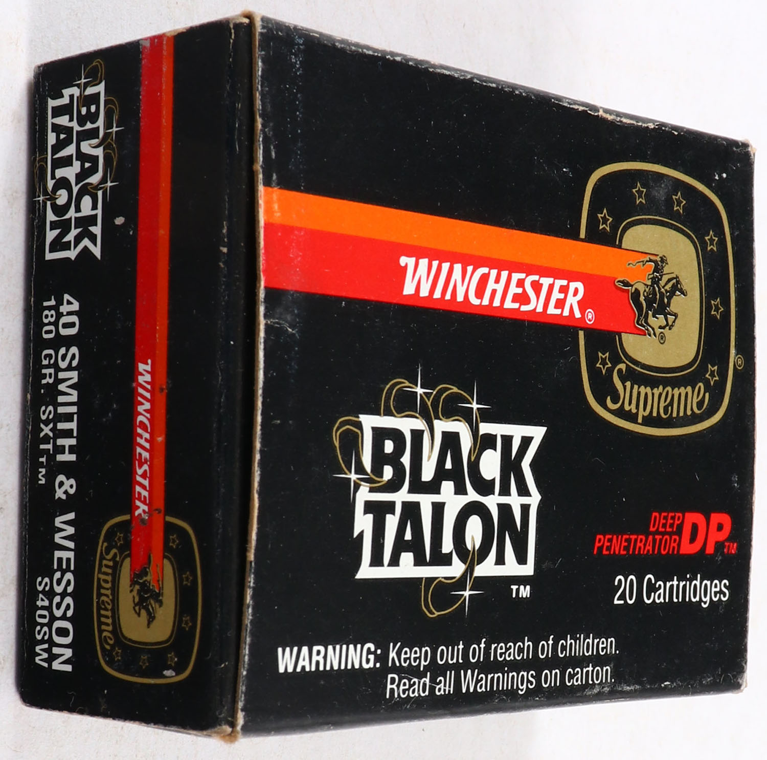 Winchester, Black Talon, .40 Smith & Wesson Hollow Point, 180 Grain SXT, Full, 1pc. Black box, box is solid with minty color, minor edge & corner wear, end flaps are solid, ammo is excellent. Grade: Excellent + - Value: 40 to 120