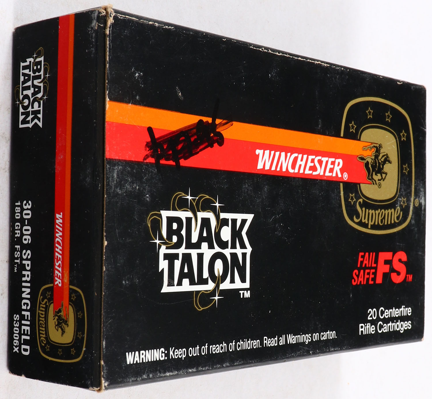 Winchester, Black Talon, .30-06 Springfield, 180 Gr. FST, Full, 1pc. Black red & orange box, box is solid with excellent color, minor shelf wear, very minor edge & corner wear, end flaps are solid, ammo is excellent to minty. Grade: Excellent - Value: 40 to 200