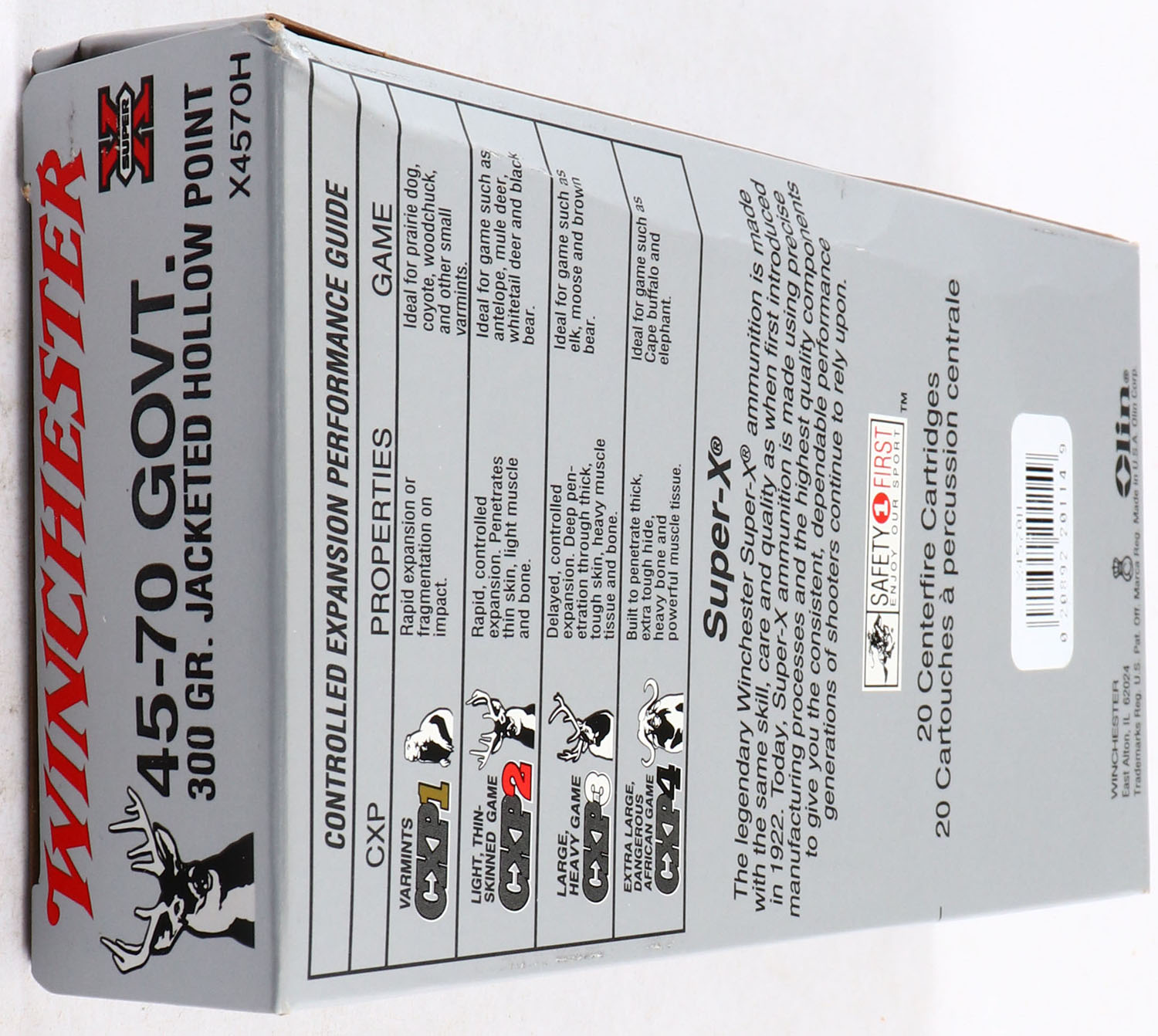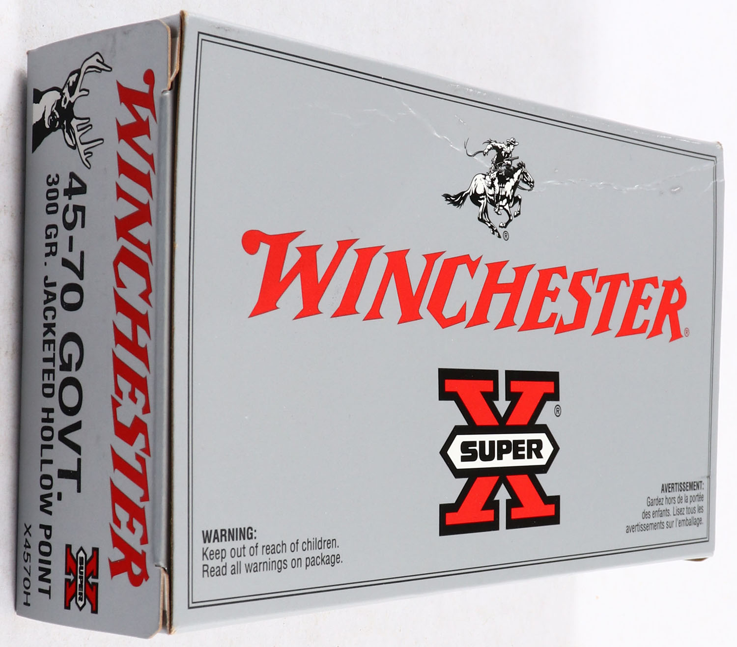 Winchester, Super X, .45-70 Govt, 300 Grain Jacketed Hollow Point, Full, 1pc. Silver & red box, box is solid with minty color, box has a crease on top, edges are crisp, end flaps are solid, ammo is excellent to minty. Grade: Excellent + - Value: 30 to 90