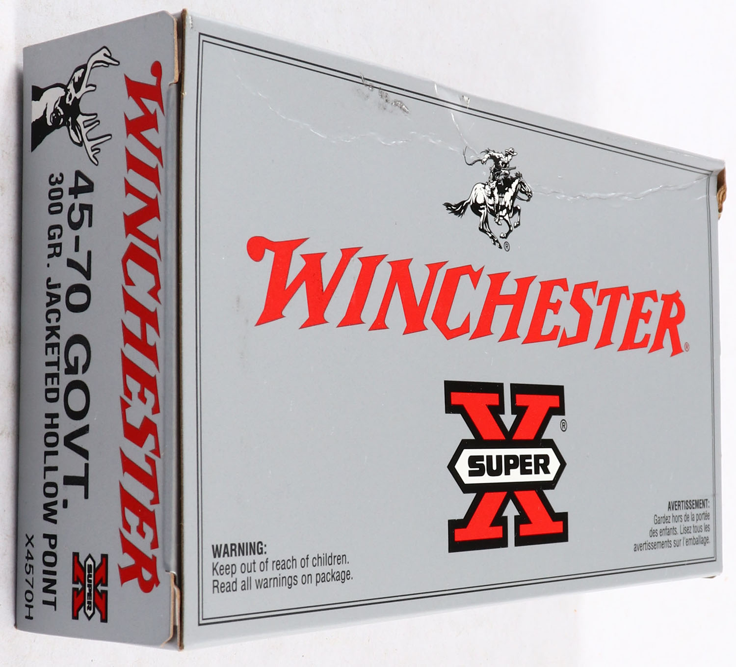 Winchester, Super X, .45-70 Govt, 300 Grain Jacketed Hollow Point, Full, 1pc. Silver & red box, box is solid with minty color, box has a crease to top, edges are crisp, end flaps are solid, ammo is excellent to minty. Grade: Excellent + - Value: 30 to 90