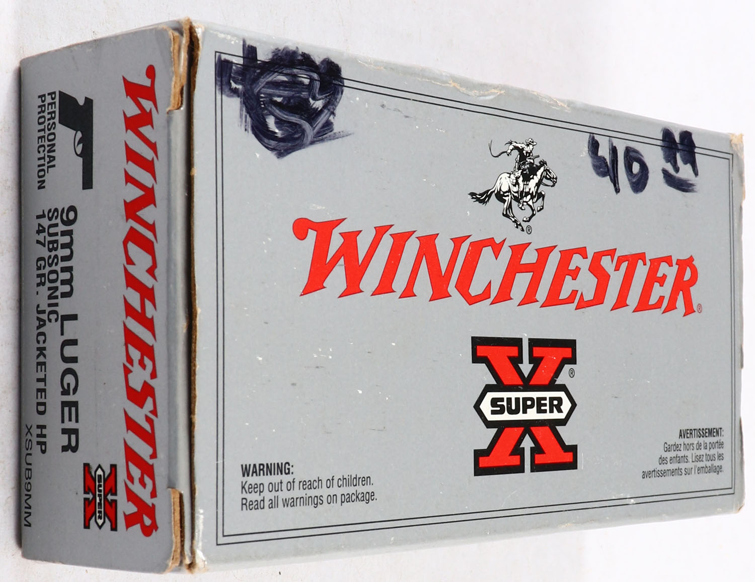 Winchester, Super X, 9mm Luger Subsonic, 147 Grain Jacketed Hollow Point, Full, 1pc., Multi-colored box, box is solid with great color, box has writing on top, Ammo is excellent. Grade: Excellent - Value: 20 to 60