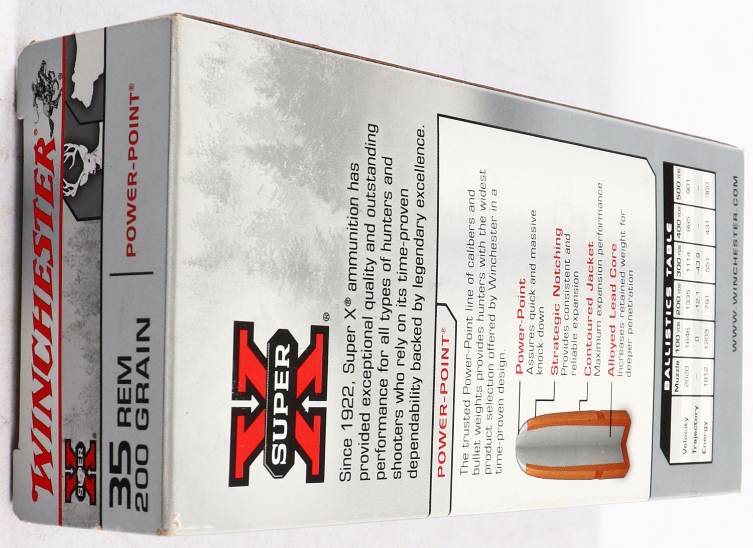 Winchester, Super X, .35 Rem., 200 Gr. Power Point bullet, 1pc, Full, gray box with black/red print, box is MINT with mint color, corners are sharp, edges are crisp, end flaps are solid, ammo is minty. Grade: MINT - Value: 30 to 90