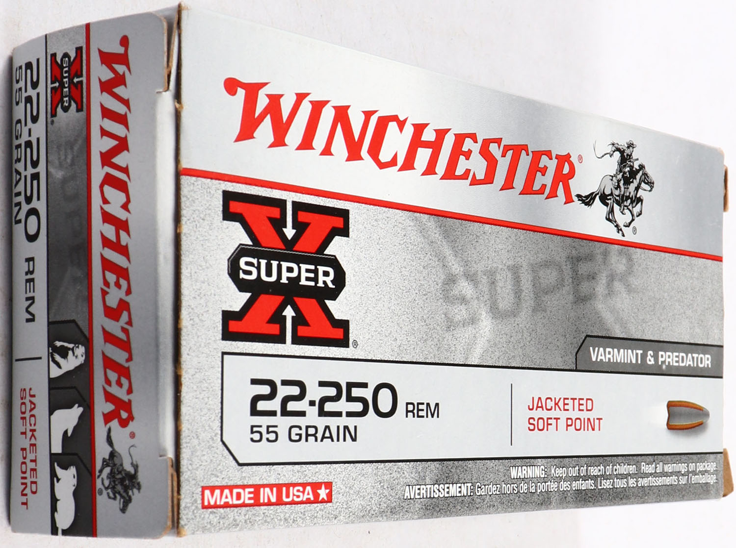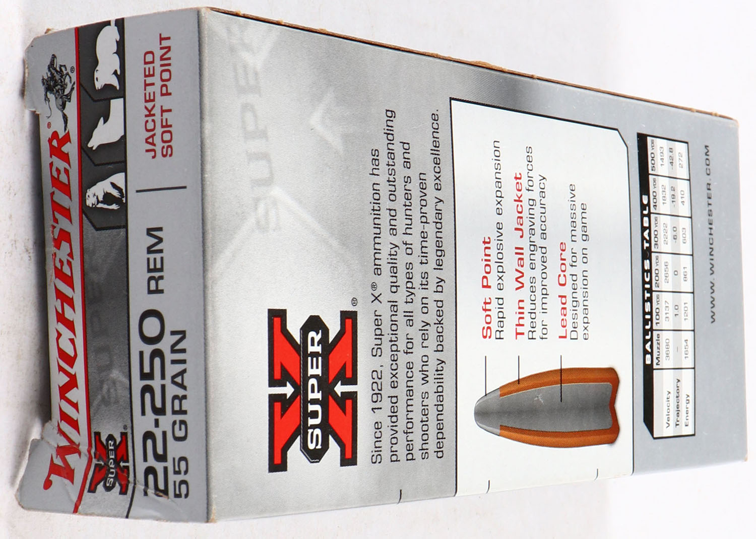 Winchester, Super X, .22-250 Remington, 55 Grain Jacketed Soft Point, Full, 1pc. Gray & red box, box is solid with minty color, very minor corner wear, edges are crisp, end flaps are solid, ammo is minty. Grade: Excellent ++ - Value: 20 to 60