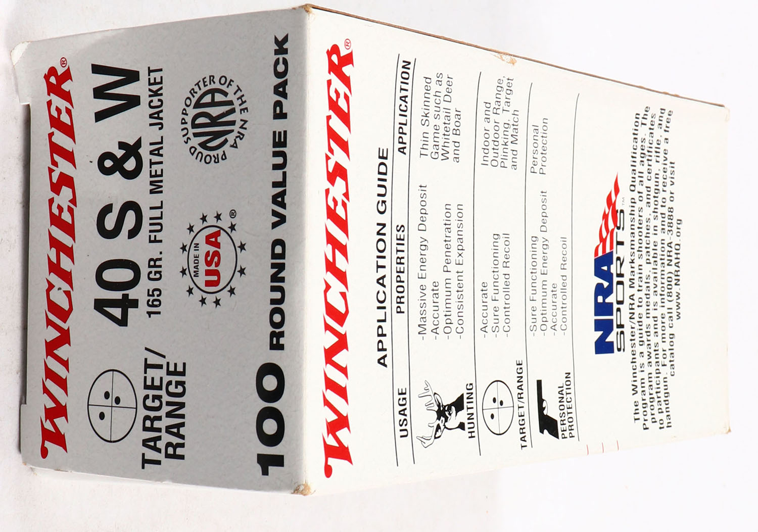 Winchester, .40 S&W, 165 Gr. FMJ, 1pc, Full 100rds., white box with black/red print, box is very solid, ammo is excellent. Grade: Excellent ++ - Value: 30 to 90