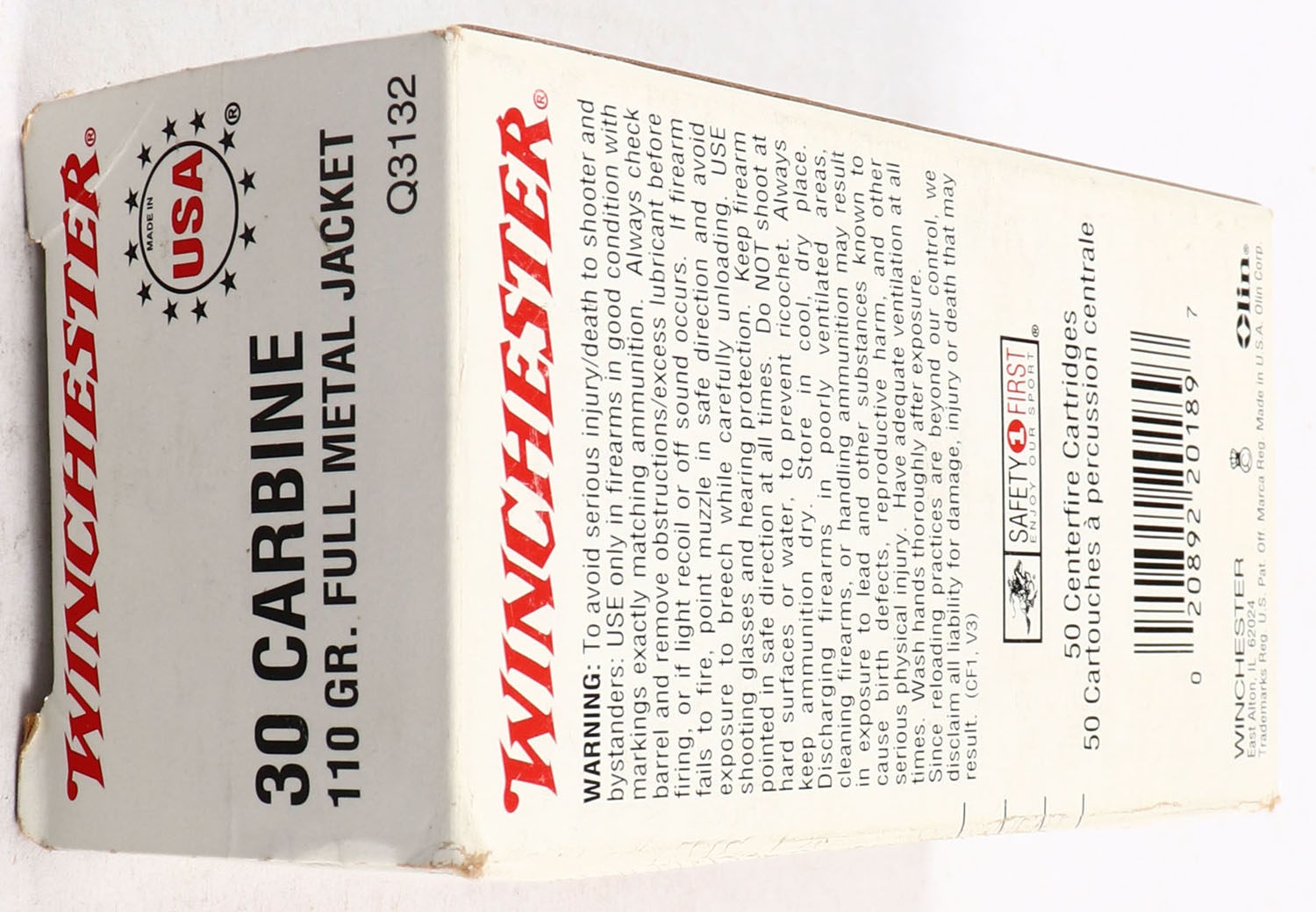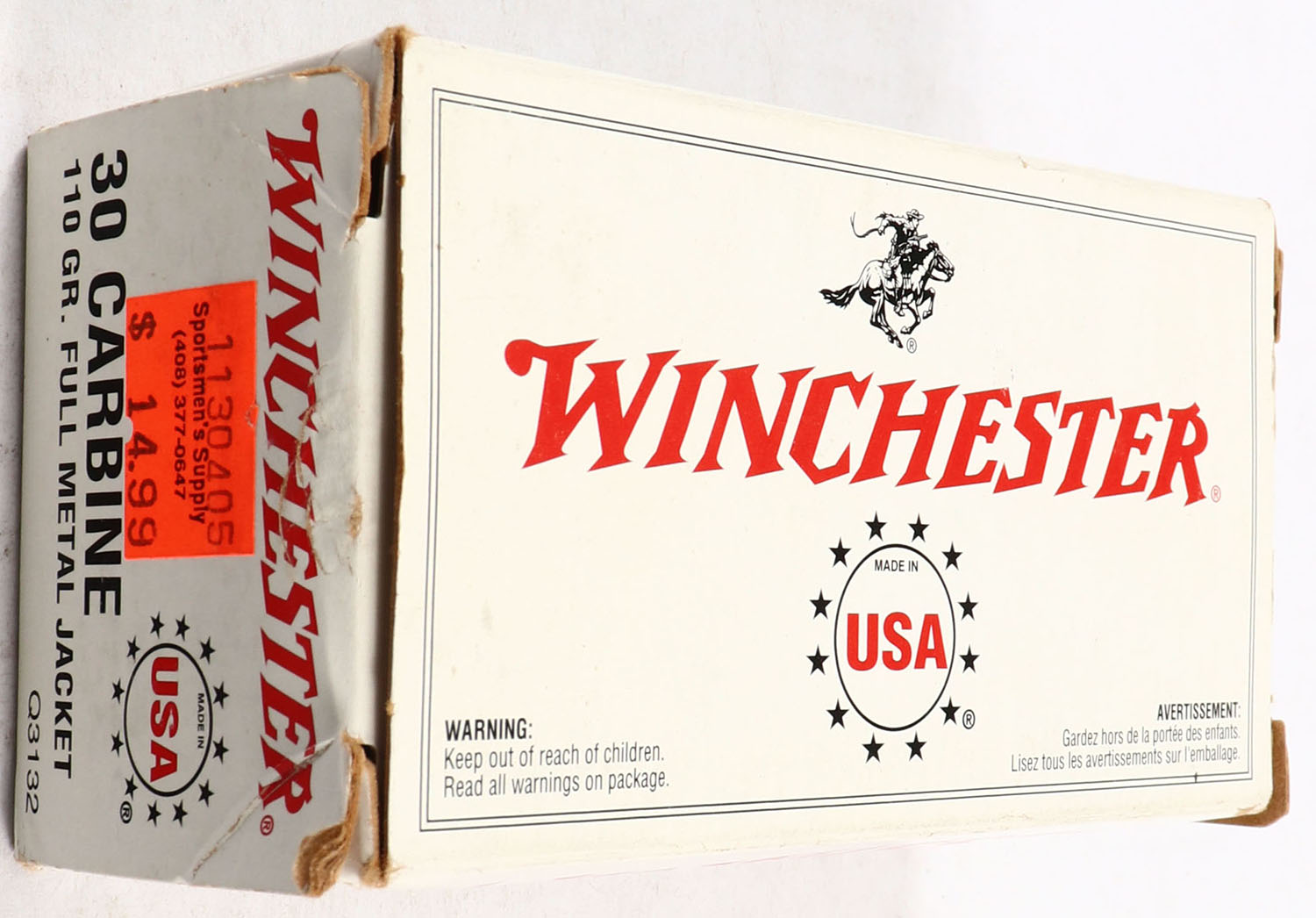 Winchester, .30 Carbine, 110 Grain F.M.J, Full, 1pc., Multi-colored box, box is solid with great color, ammo is excellent. Grade: Excellent + - Value: 20 to 60