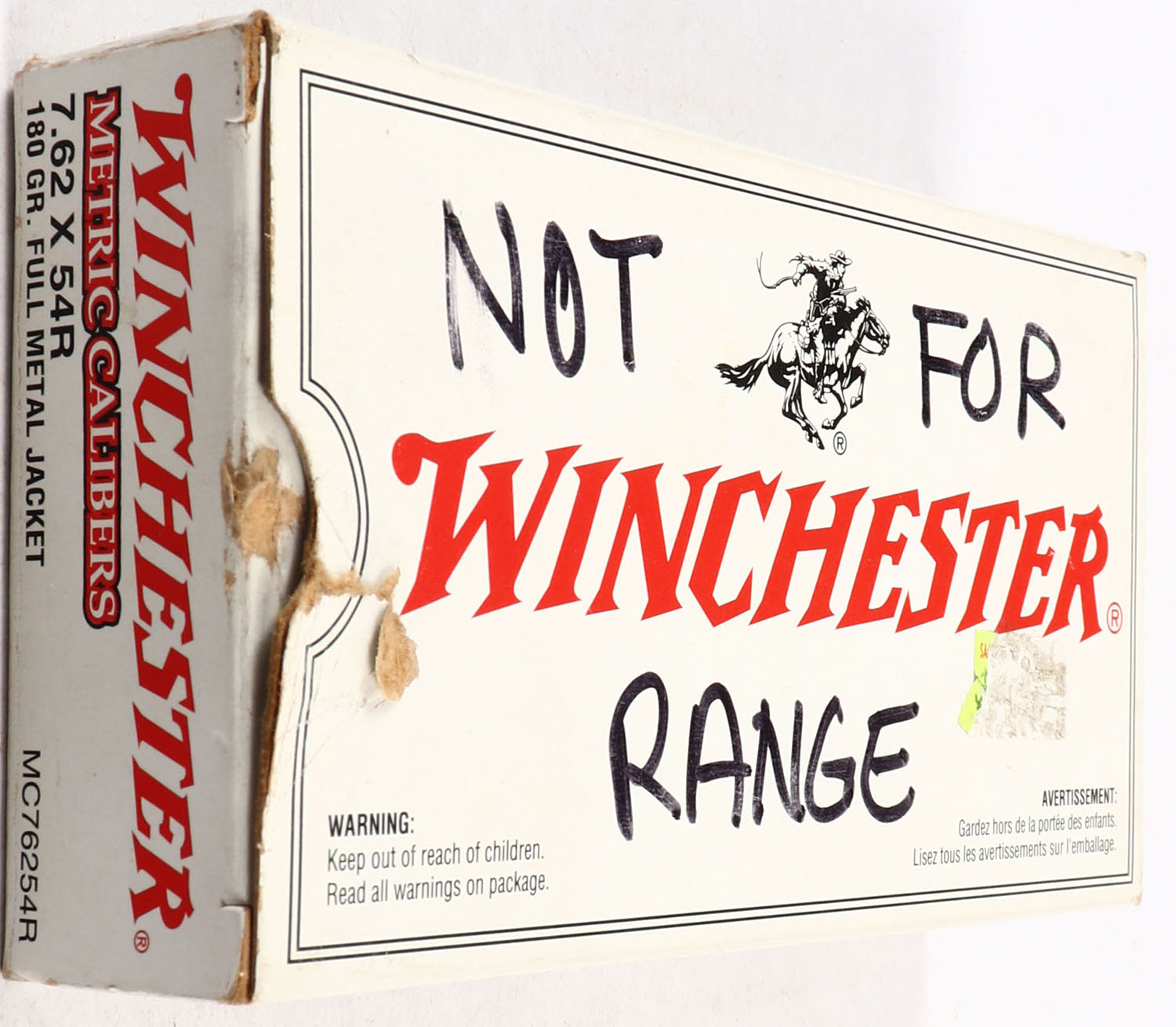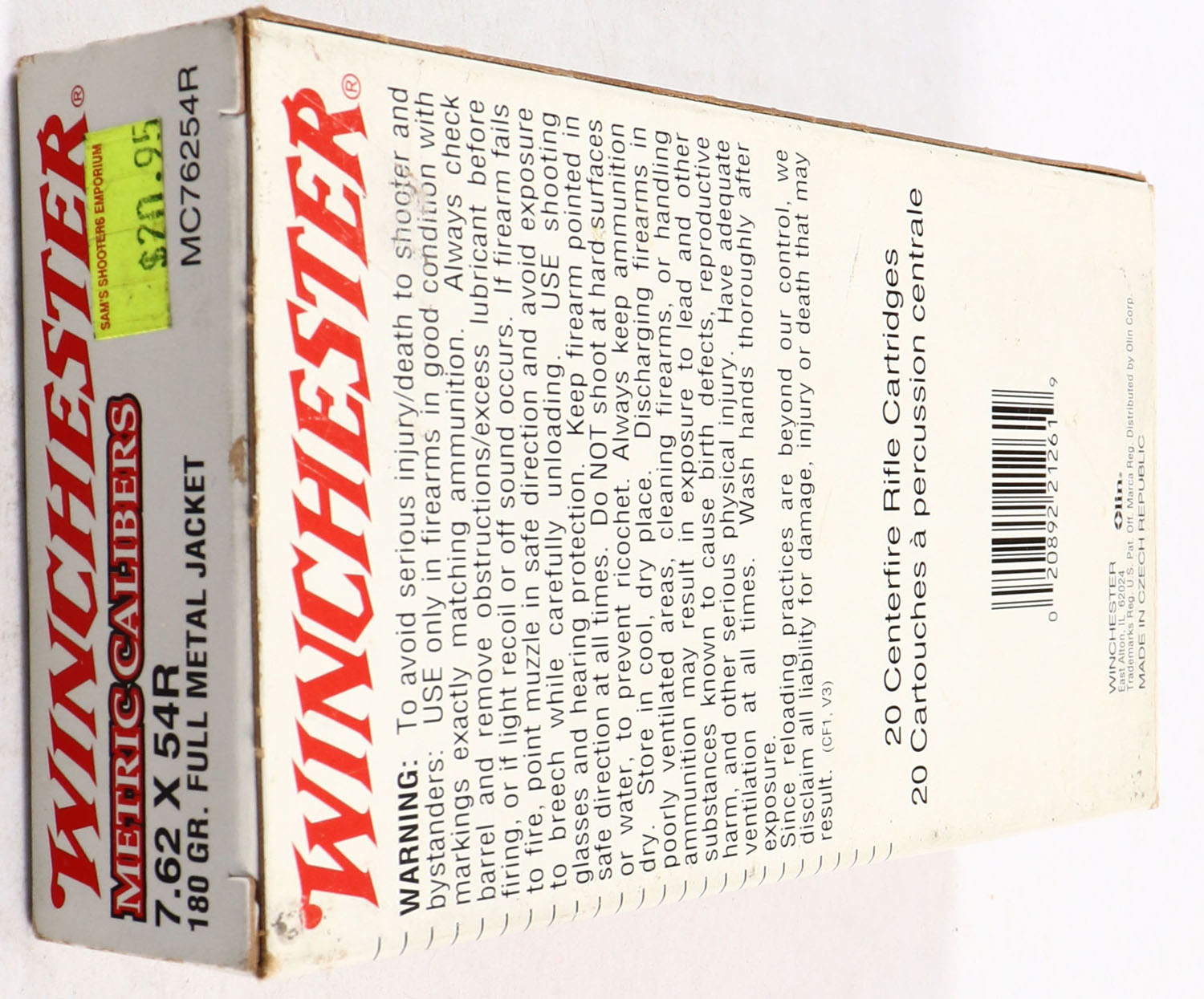 Winchester, 7.62 x 54R, 180 Gr. F.M.J, 1pc, Partial 18rds., White box with red & black print, box is solid with writing on top, ammo is very good. Grade: Vey Good ++ - Value: 10 to 40
