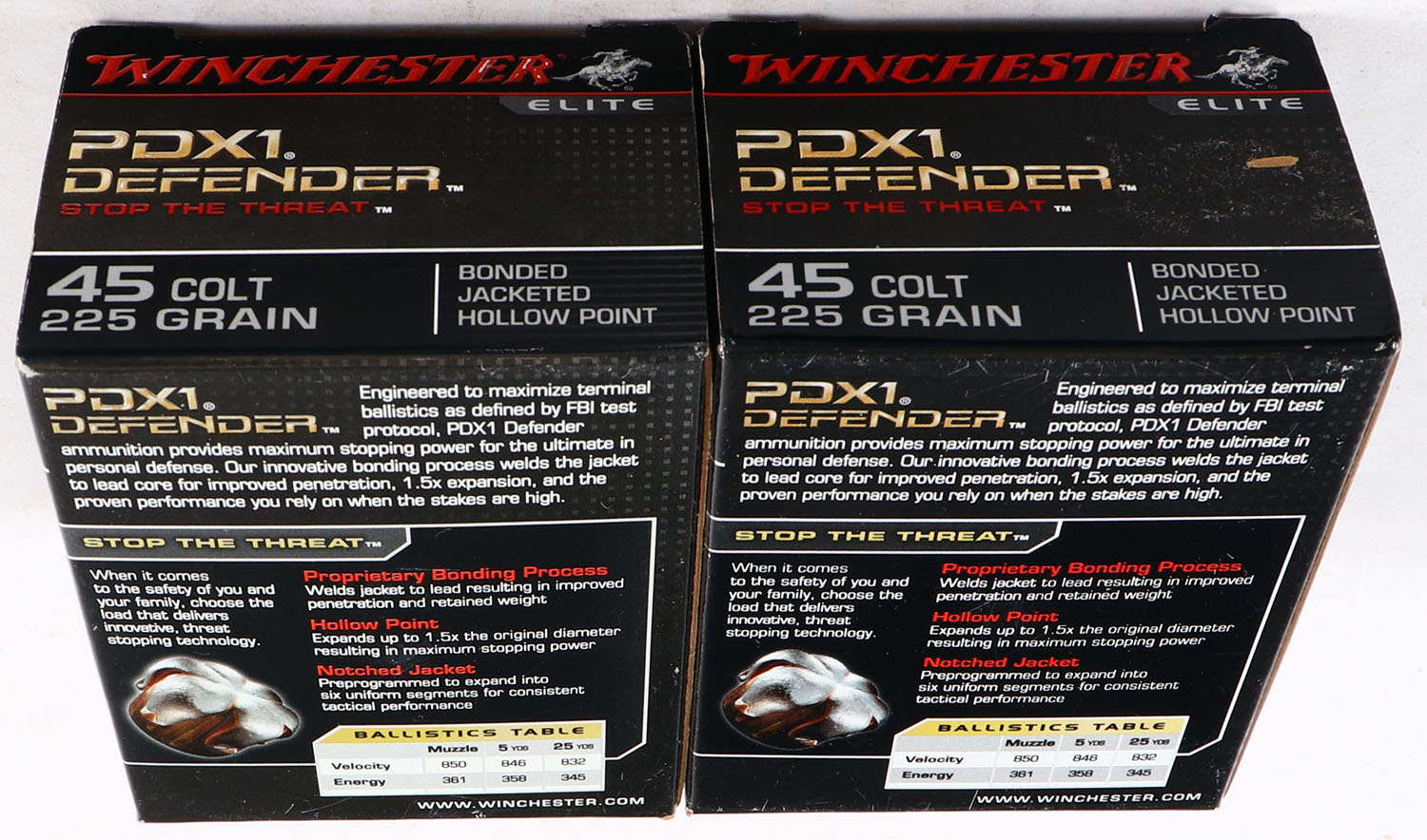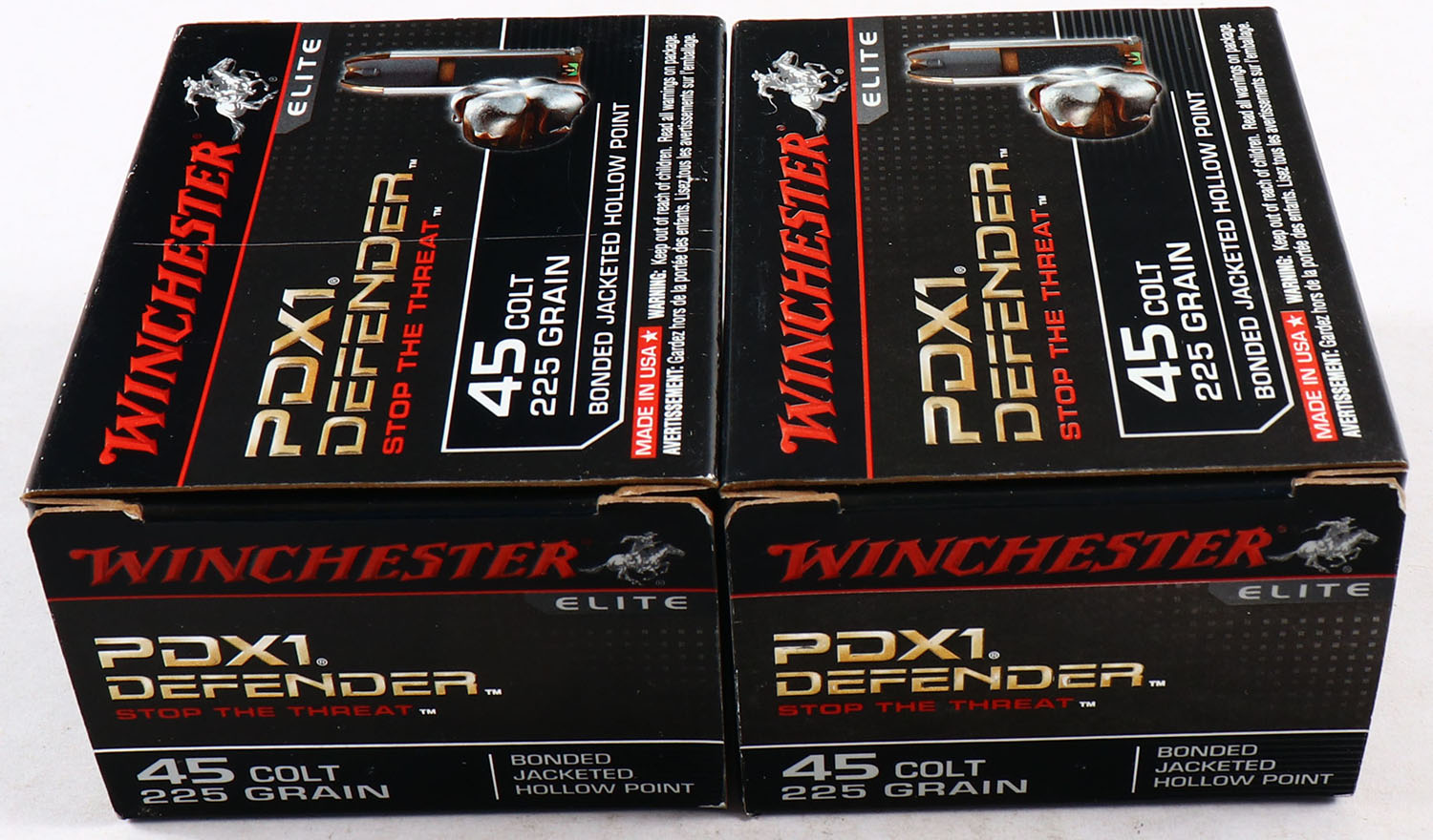 Winchester, Lot of (2), PDX1 Defender, .45 Colt, 225 Grain Bonded Jacketed Hollow Point, Full, 1pc. Black & red boxes, boxes are near mint with minty color, only very minor corner wear, edges are crisp, end flaps are solid, ammo is minty. Grade: Excellent ++ - Value: 40 to 80