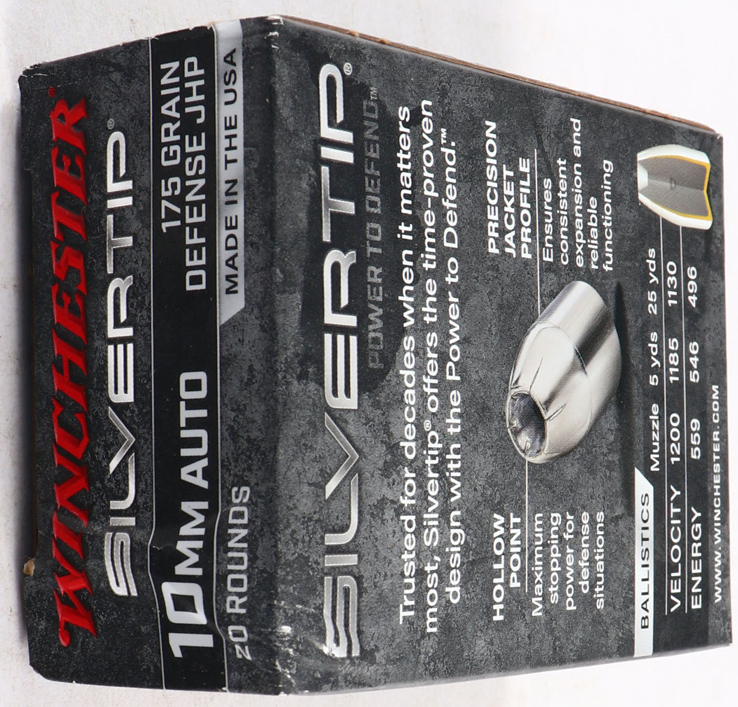 Winchester, Silvertip, 10mm Auto, 175 Grain Defense JHP, Full, 1pc. Black box with good color, corners are sharp, edges are crisp, end flaps are solid, ammo is minty. Grade: MINT - Value: 20 to 60