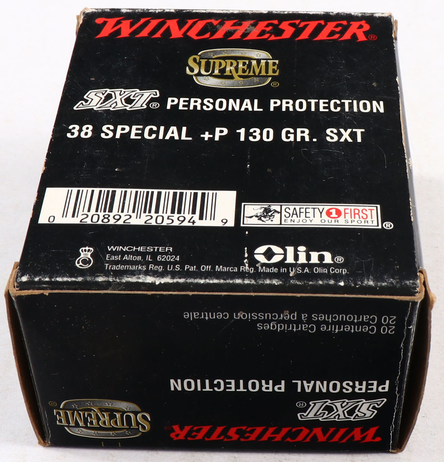 Winchester, Supreme, 38 Special +P, 130 Grain SXT, Full, 1pc. Black red & white box, box is solid with very good color, shelf wear, end flaps are solid, ammo is excellent. Grade: Excellent - Value: 20 to 60