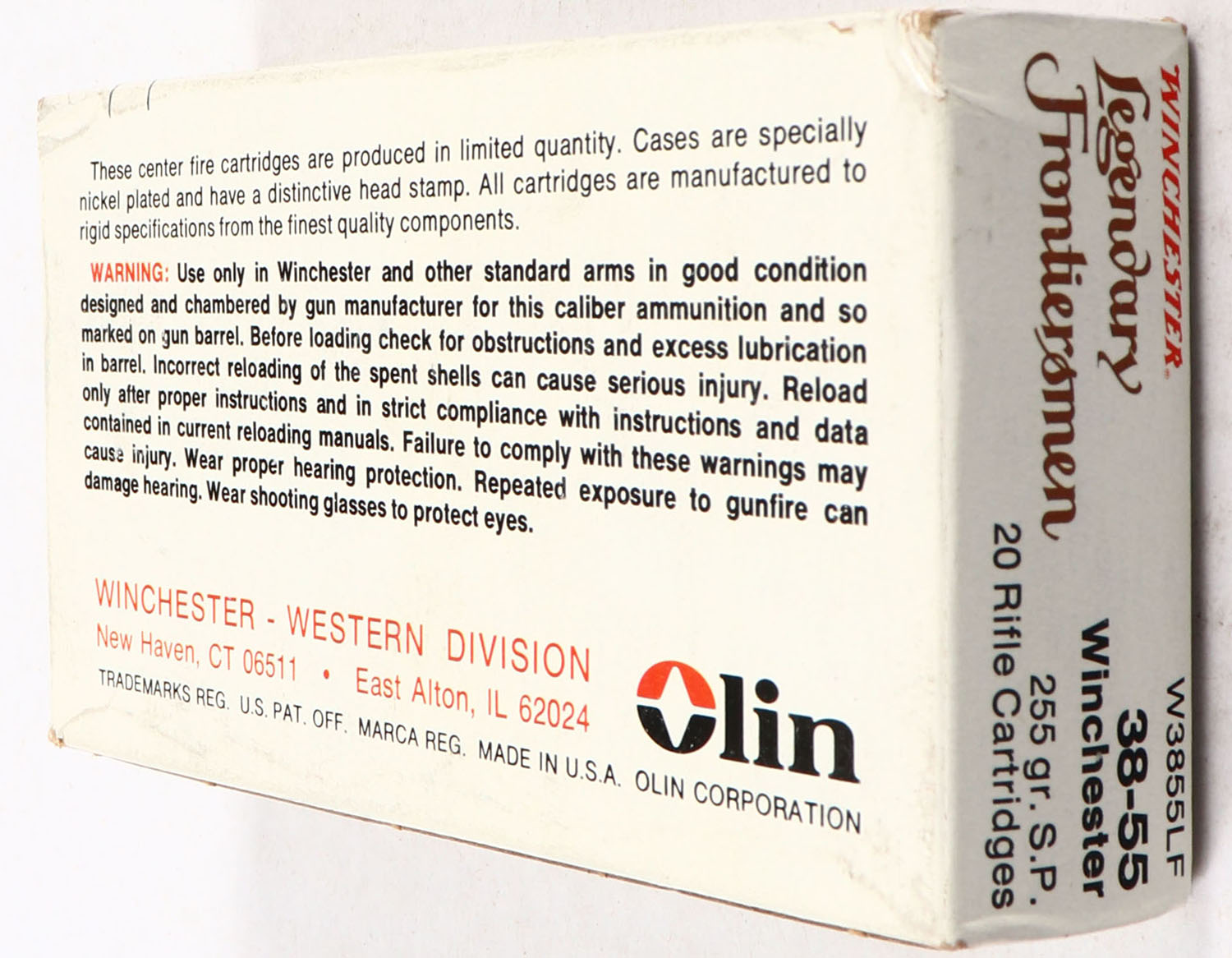 Winchester, Legendary Frontiersmen, .38-55 Winchester, 255 Grain Soft Point, Full, 1pc. Multi-colored box, box is solid with excellent color, very minor age soiling & corner wear, edges are mostly crisp, end flaps are solid, ammo is minty. Grade: Excellent + - Value: 50 to 150