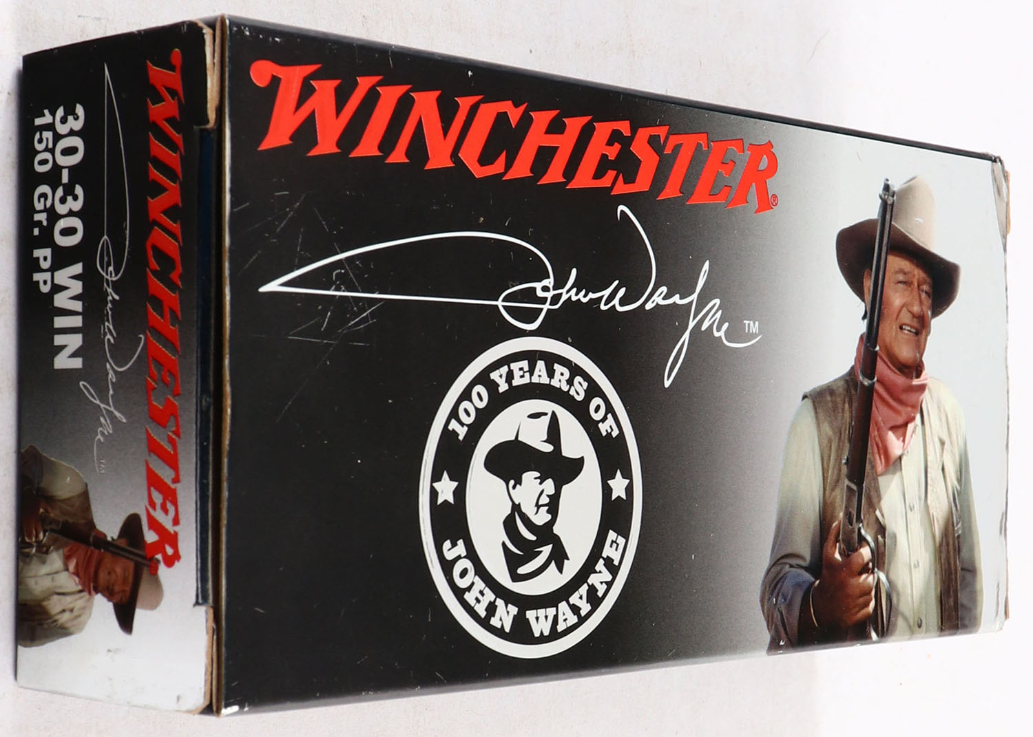 Winchester, 100 YEARS OF JOHN WAYNE BOX, 30-30 WIN, 1pc, Full, 150 Gr. PP, black & Silver box with red & white, John Wayne on box, warning label, nice bright box, light scuff, ammo is MINT. Grade: Excellent ++ - Value: 40 to 120